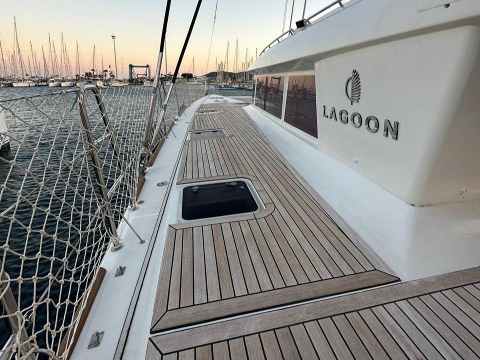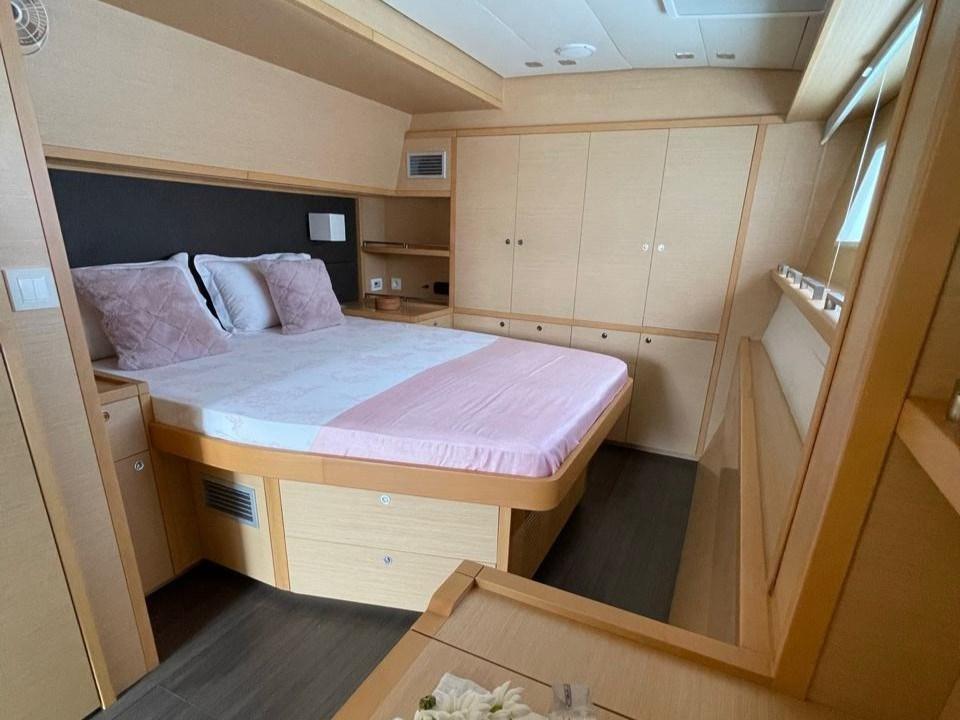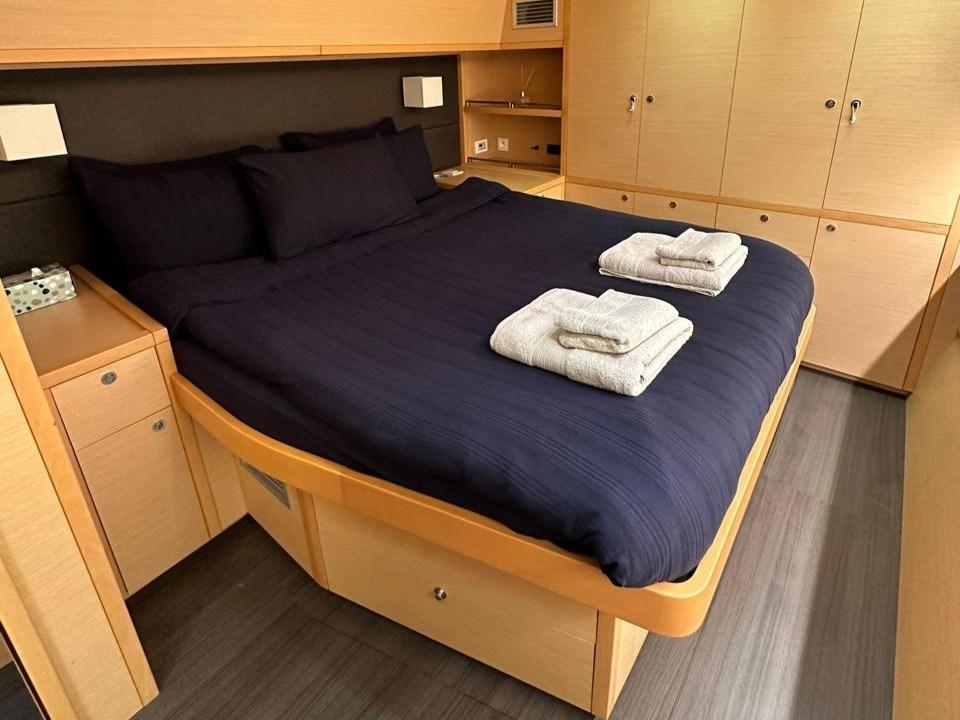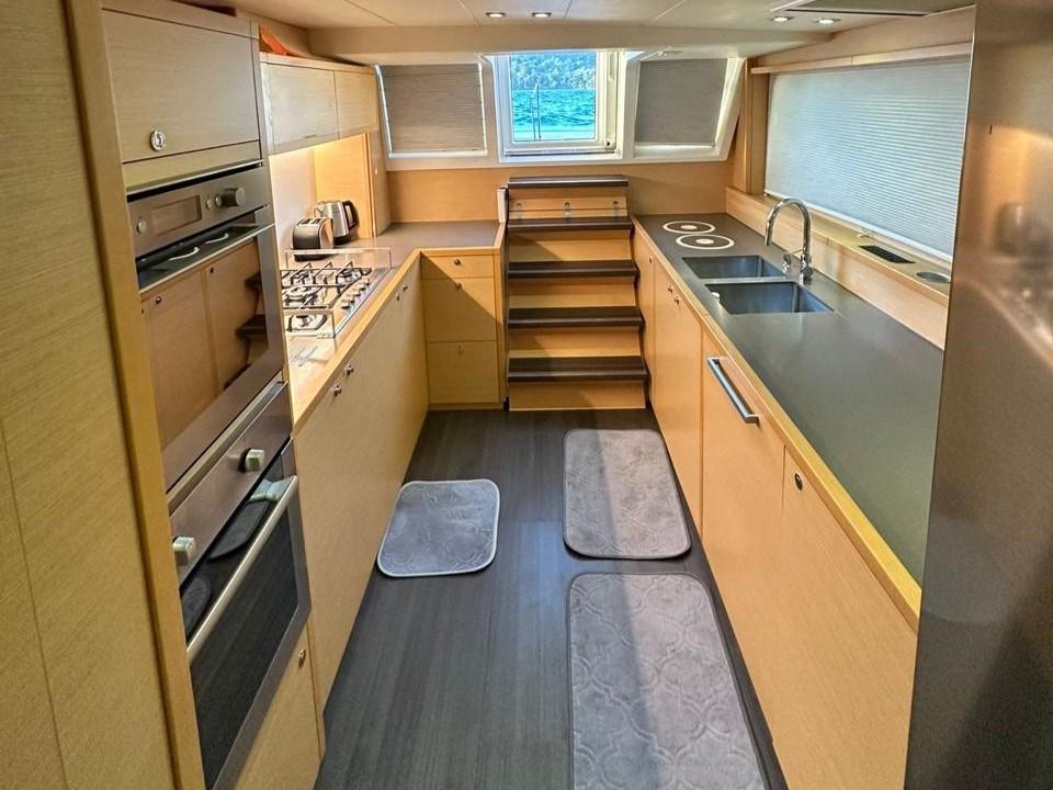 La cuisine est située dans la coque bâbord, séparée de la pièce principale, avec un double accès, depuis le salon et le cockpit, et est équipée d’un double évier, d’une plaque à gaz à 5 brûleurs, ainsi que d’appareils modernes comprenant un four, un micro-ondes, un réfrigérateur à colonne, un congélateur et un lave-vaisselle