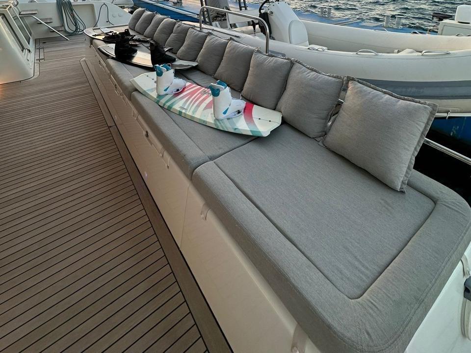 Le pont principal s’étend au-dessus du cockpit arrière, conçu comme une terrasse surplombant la mer, tandis que la passerelle aérienne, accessible par un escalier, offre une seconde zone de contrôle et de détente avec sièges et de grands ponts solaires