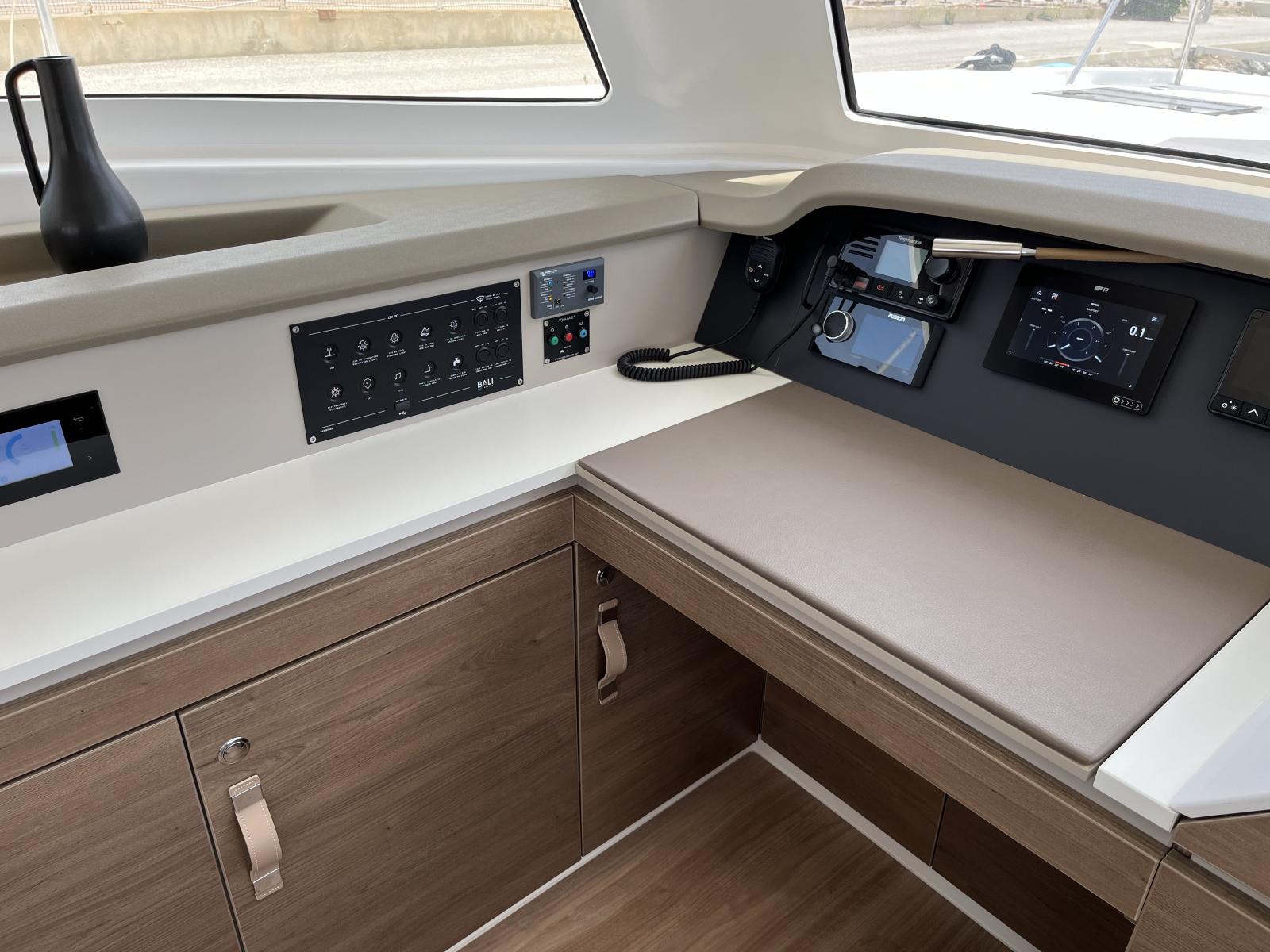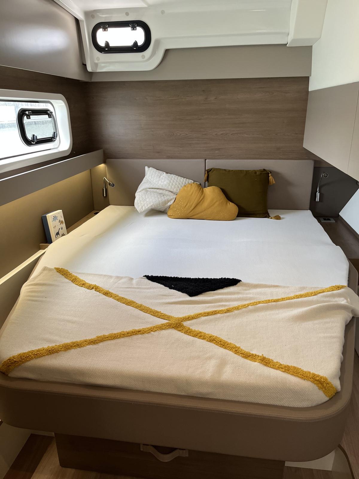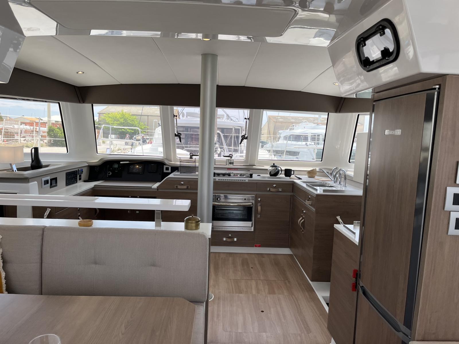 Pensé pour offrir une vie à bord agréable et autonome, il dispose d’un dessalinisateur 105 L/h, de panneaux solaires et d’une cuisine entièrement équipée avec plancha, idéale pour des moments conviviaux en mer. Sa grande voile lattée à corne et son solent en Dacron avec lazy bag garantissent des navigations fluides et efficaces.