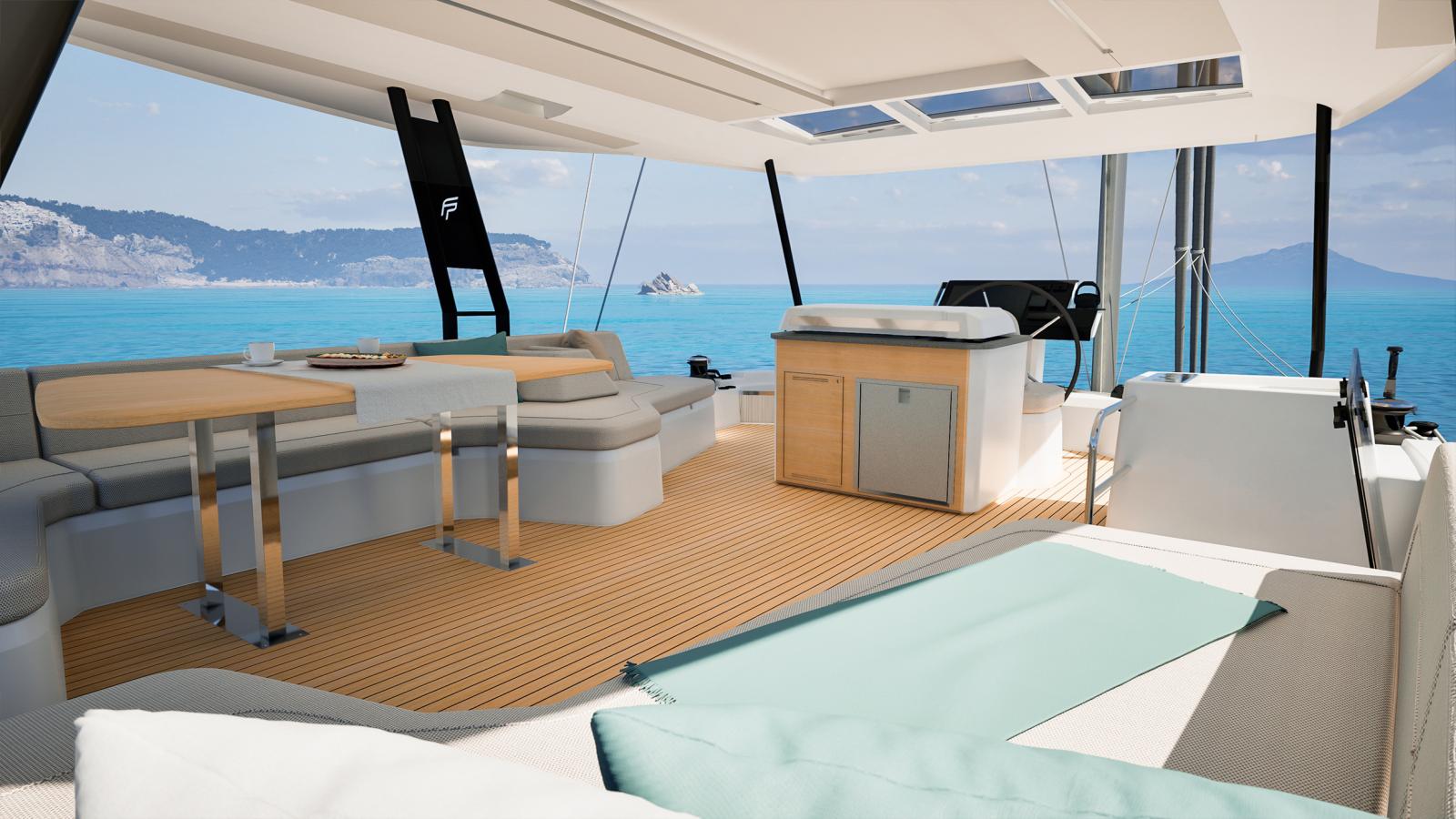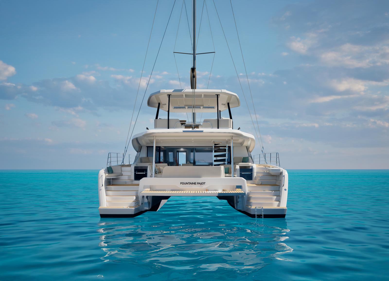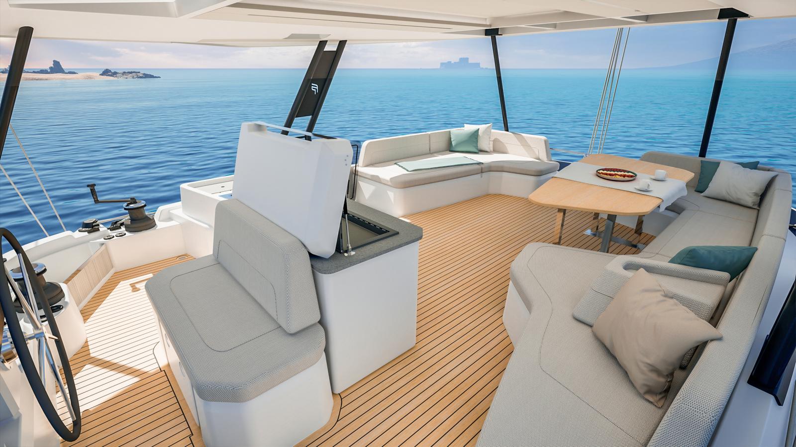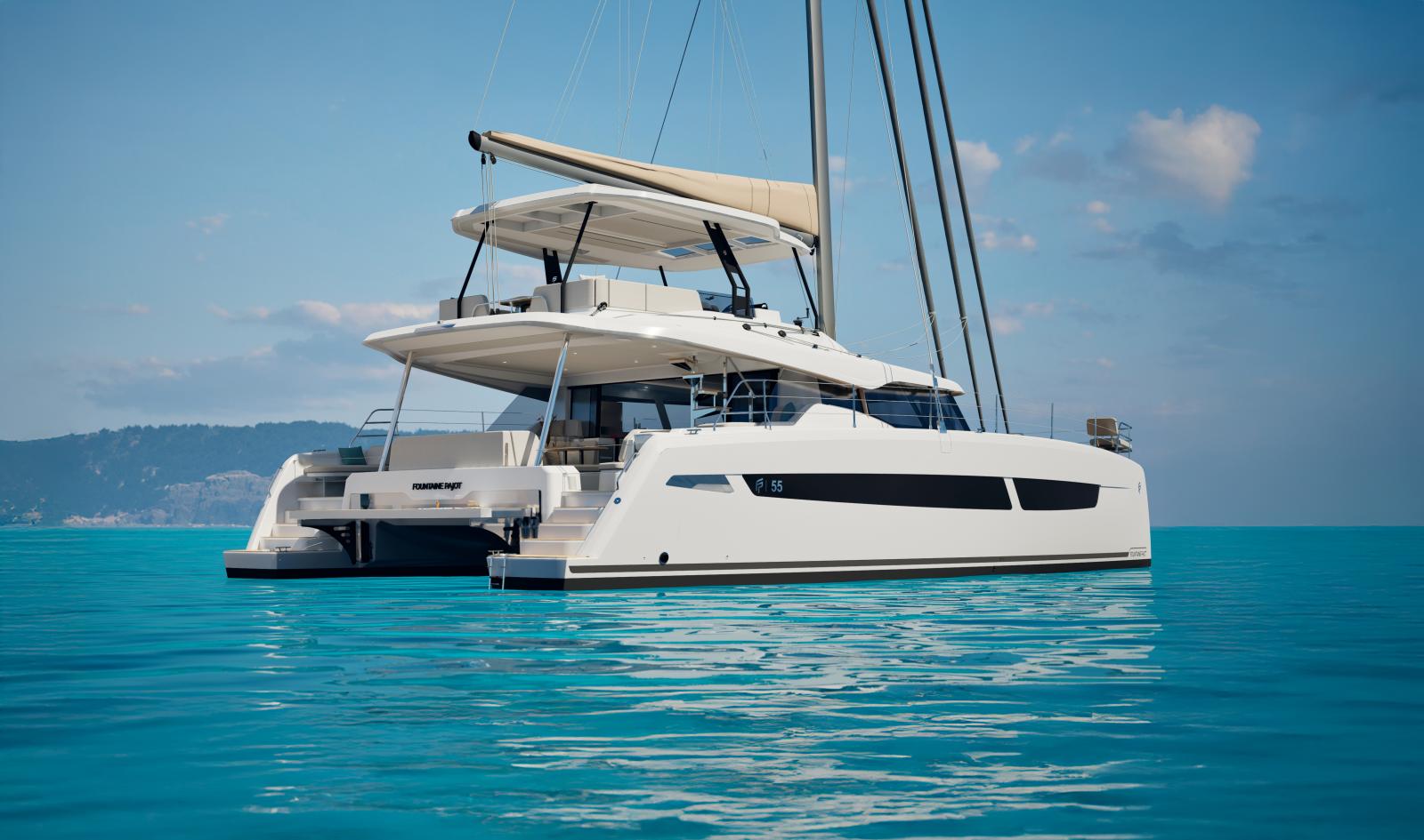 Le NEW FP | 55 ouvre les portes de la grande plaisance et intègre toutes les dernières innovations en matière d'équipements, d'aménagements et de technologies à bord. Grâce à ses 17 mètres de longueur, le FP 55 bénéficie de vastes espaces intérieurs conviviaux et baignés de lumière. La ventilation naturelle du carré est assurée par une large baie coulissante et une porte d'accès directe au cockpit avant, un aménagement jusqu'ici réservé aux modèles Flagships de la marque. Unique en son genre, le FP 55 est également le premier catamaran de la gamme à possédé un large Flybridge avec poste de barre centralisé, regroupant toutes les manœuvres et offrant une vue panoramique à 360°. Pour sa taille, le FP 55 est le seul catamaran à proposer deux suites propriétaires identiques, situées dans chacune des coques, tout en conservant deux cabines d'équipage indépendantes et entièrement équipées.
