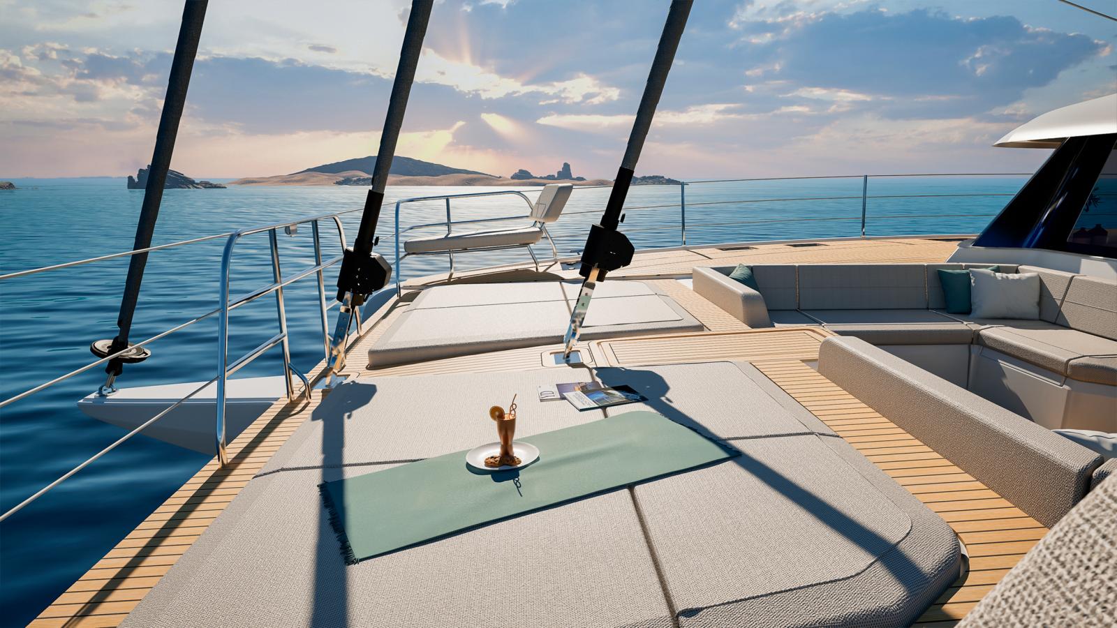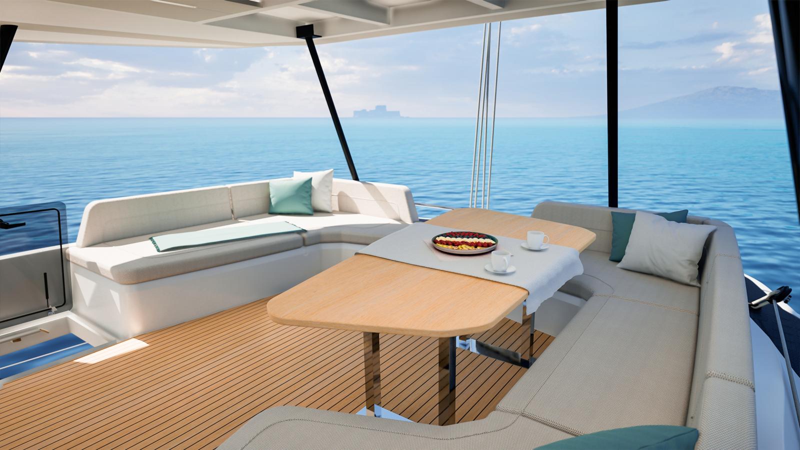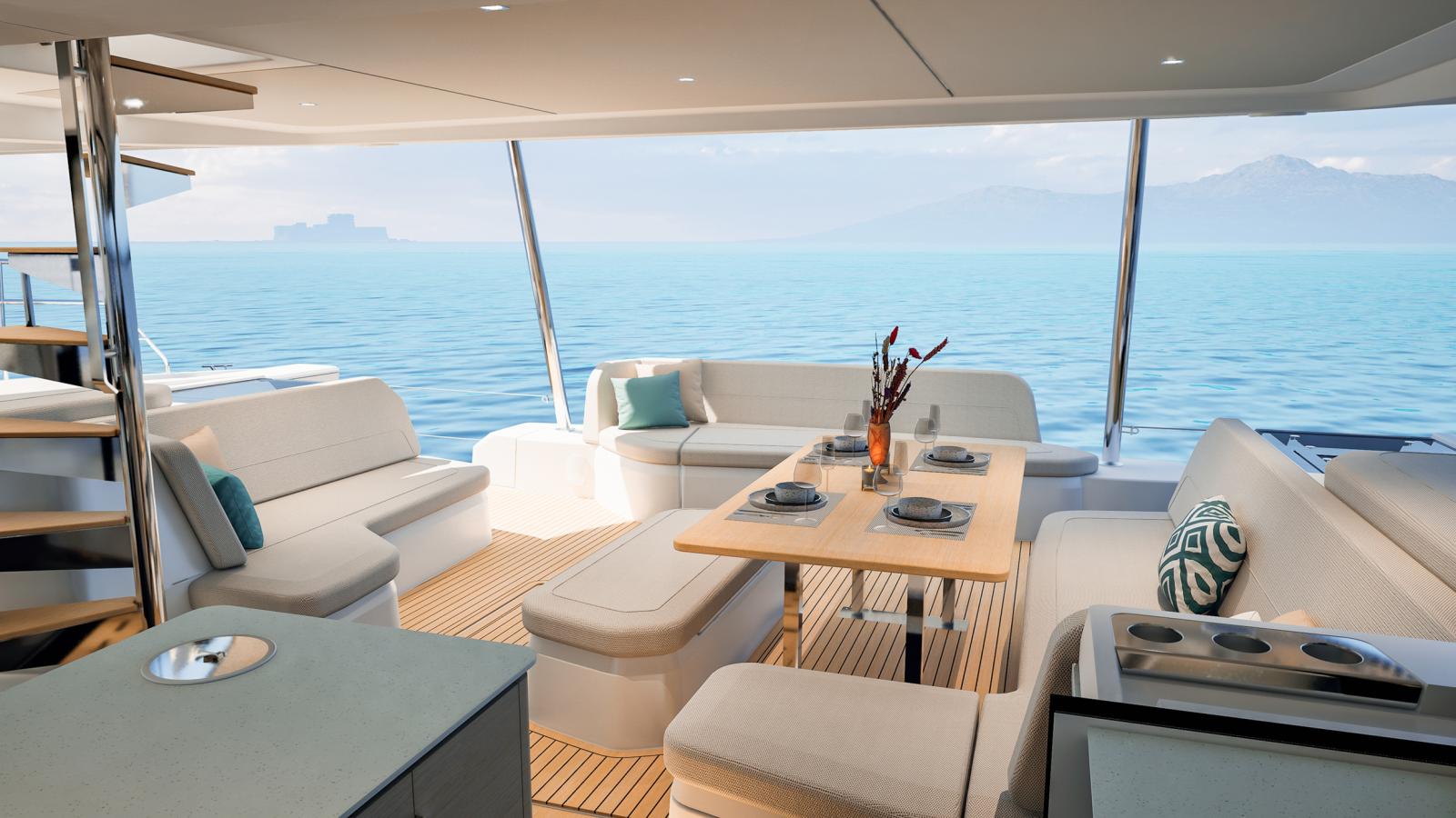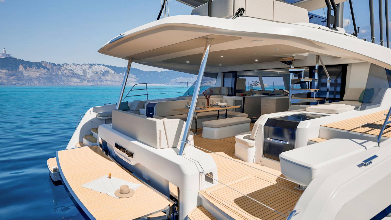 Le NEW FP | 55 ouvre les portes de la grande plaisance et intègre toutes les dernières innovations en matière d'équipements, d'aménagements et de technologies à bord. Grâce à ses 17 mètres de longueur, le FP 55 bénéficie de vastes espaces intérieurs conviviaux et baignés de lumière. La ventilation naturelle du carré est assurée par une large baie coulissante et une porte d'accès directe au cockpit avant, un aménagement jusqu'ici réservé aux modèles Flagships de la marque. Unique en son genre, le FP 55 est également le premier catamaran de la gamme à possédé un large Flybridge avec poste de barre centralisé, regroupant toutes les manœuvres et offrant une vue panoramique à 360°. Pour sa taille, le FP 55 est le seul catamaran à proposer deux suites propriétaires identiques, situées dans chacune des coques, tout en conservant deux cabines d'équipage indépendantes et entièrement équipées.