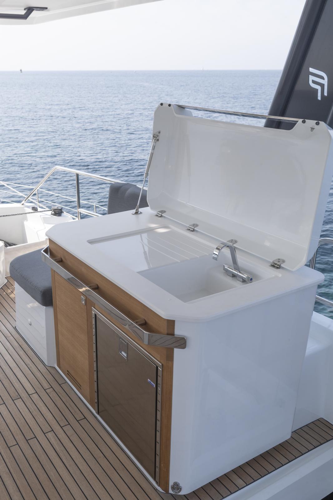 Fidèle à sa vocation d'hospitalité, ce catamaran de luxe propose deux emplacements de cuisine : une version classique formant un point de rencontre autour d'un îlot central, et une version escamotée dans la coque bâbord, à proximité des cabines de l'équipage, avec un accès direct dans le carré destiné au service.