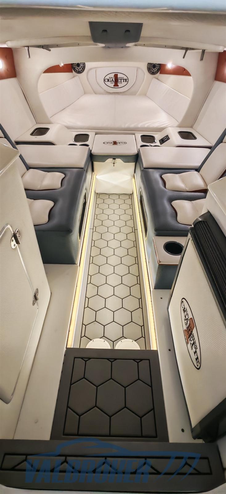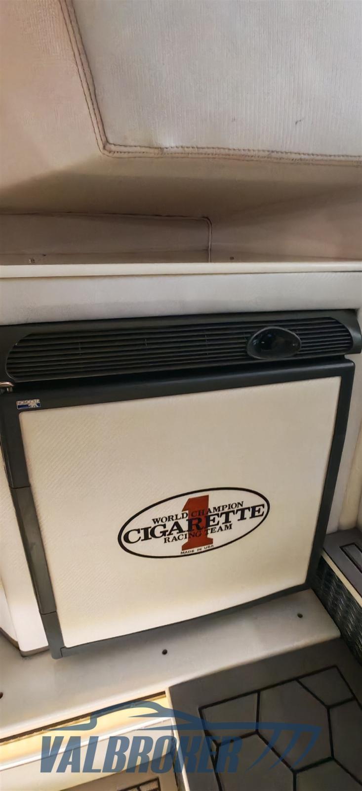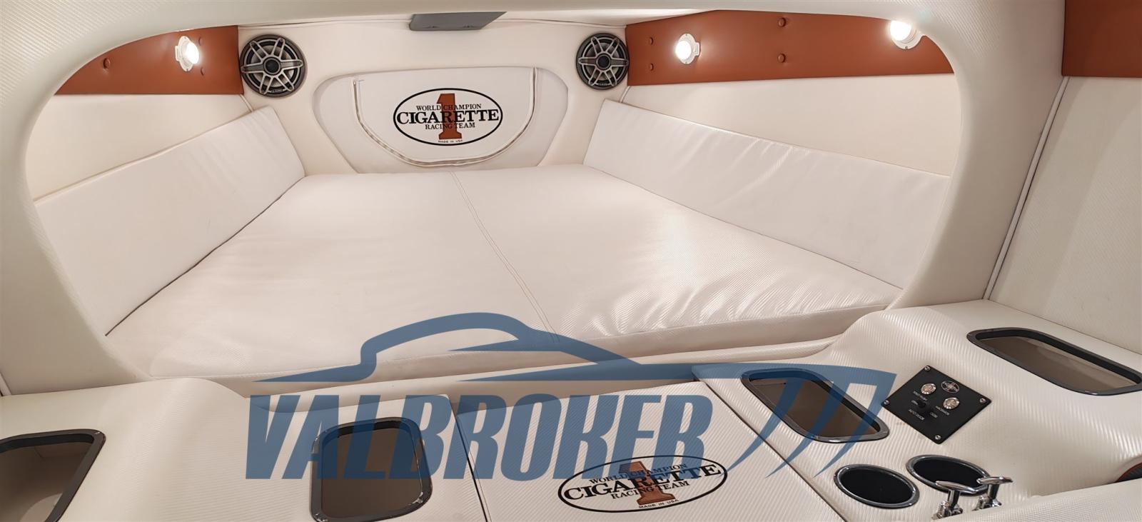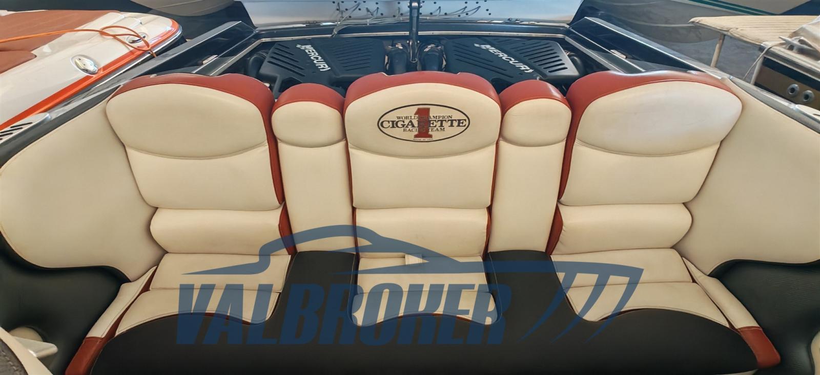 Optionnel : système d’eau douce à circuit fermé. Ordinateur Smartcraft Mercury, commandes moteur Mercury Racing, volets Mercury Racing. Sièges intérieurs en cuir sportif avec logo Cigarette 1, plancher dinette à l’aspect carbone, carénage spécial avec redanse de course. Collecteurs d’échappement à remplacer.