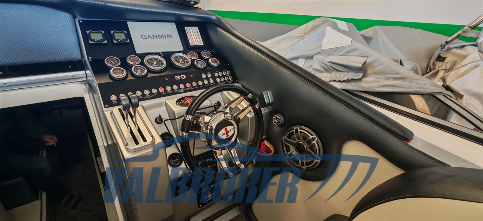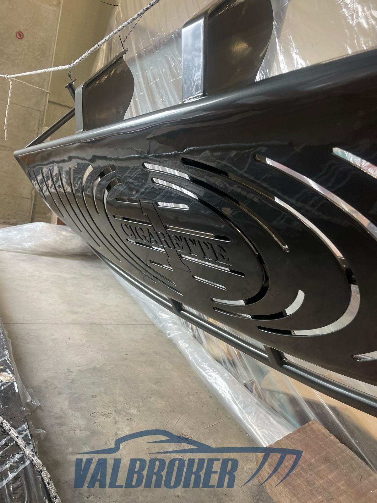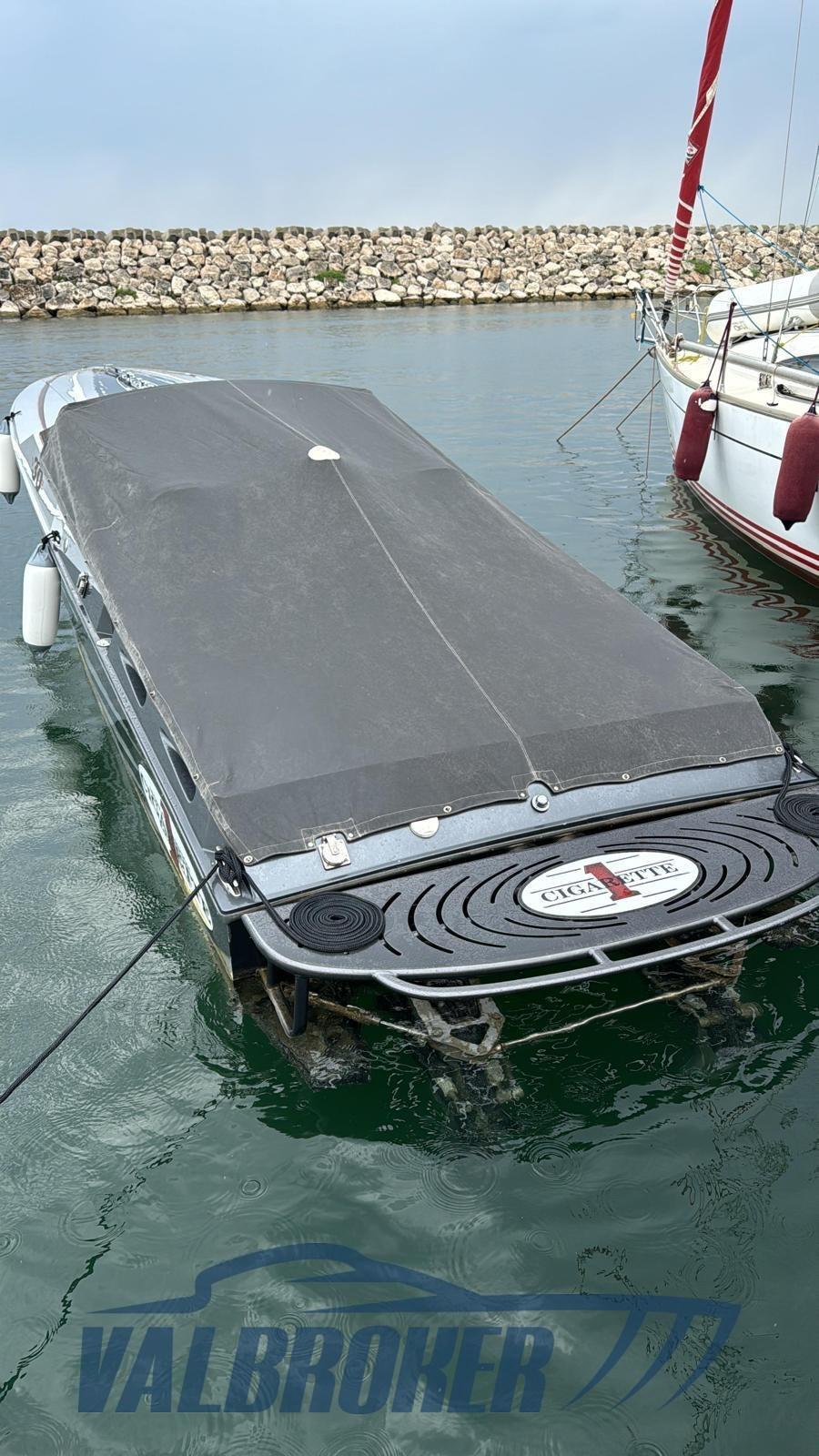 Optionnel : système d’eau douce à circuit fermé. Ordinateur Smartcraft Mercury, commandes moteur Mercury Racing, volets Mercury Racing. Sièges intérieurs en cuir sportif avec logo Cigarette 1, plancher dinette à l’aspect carbone, carénage spécial avec redanse de course. Collecteurs d’échappement à remplacer.