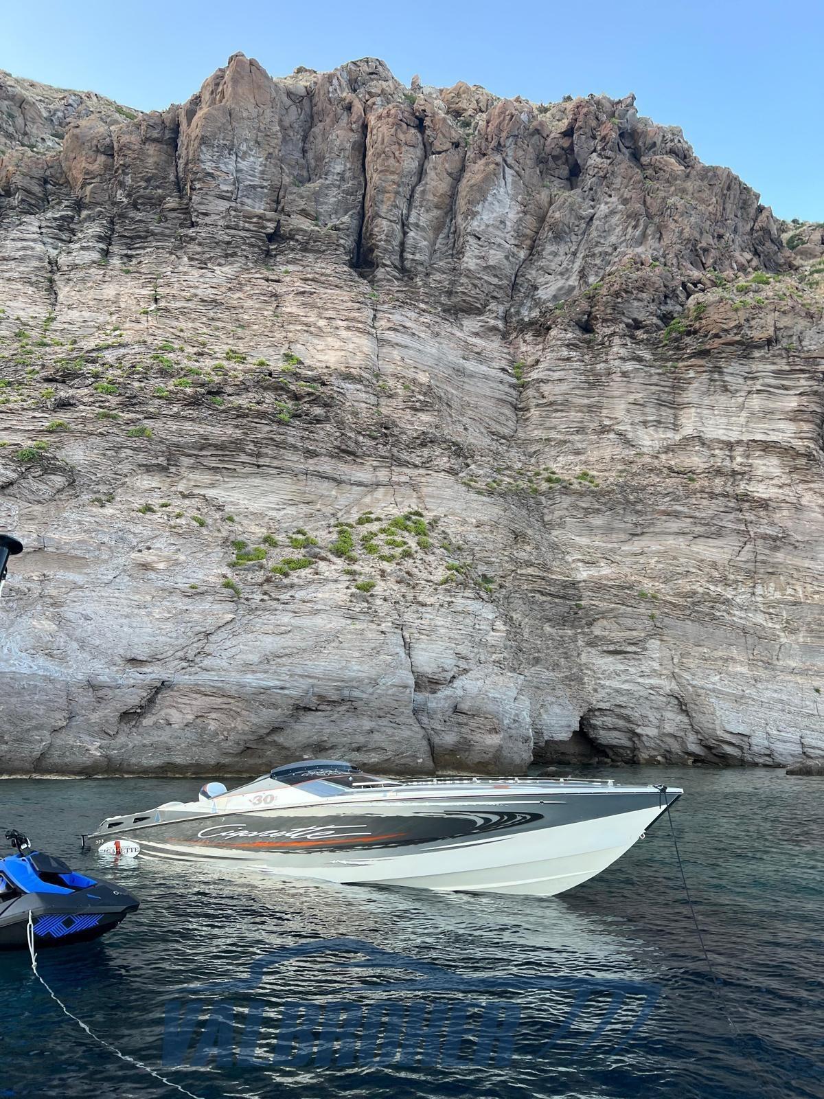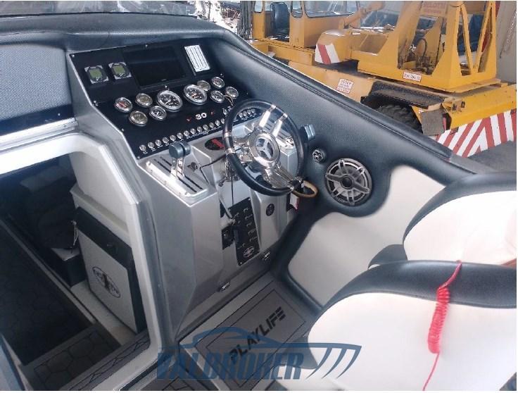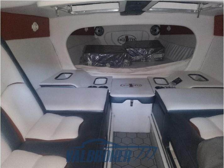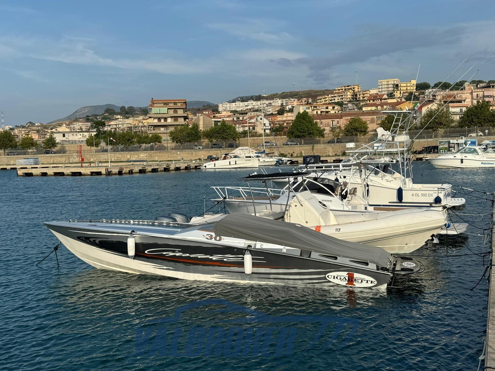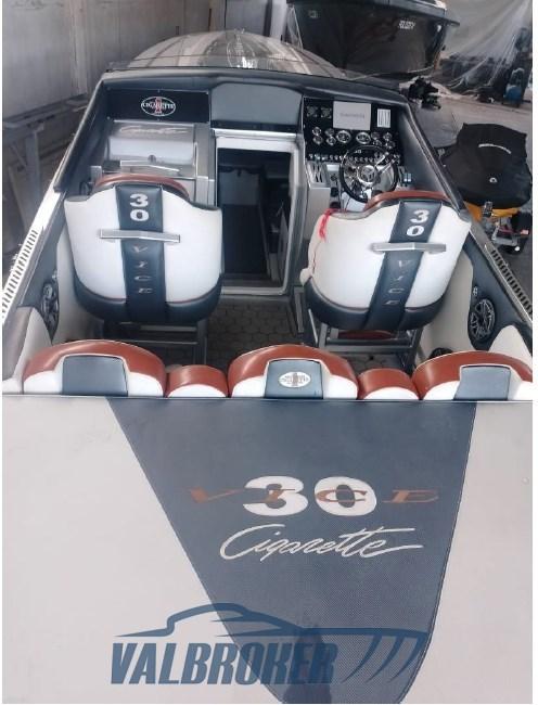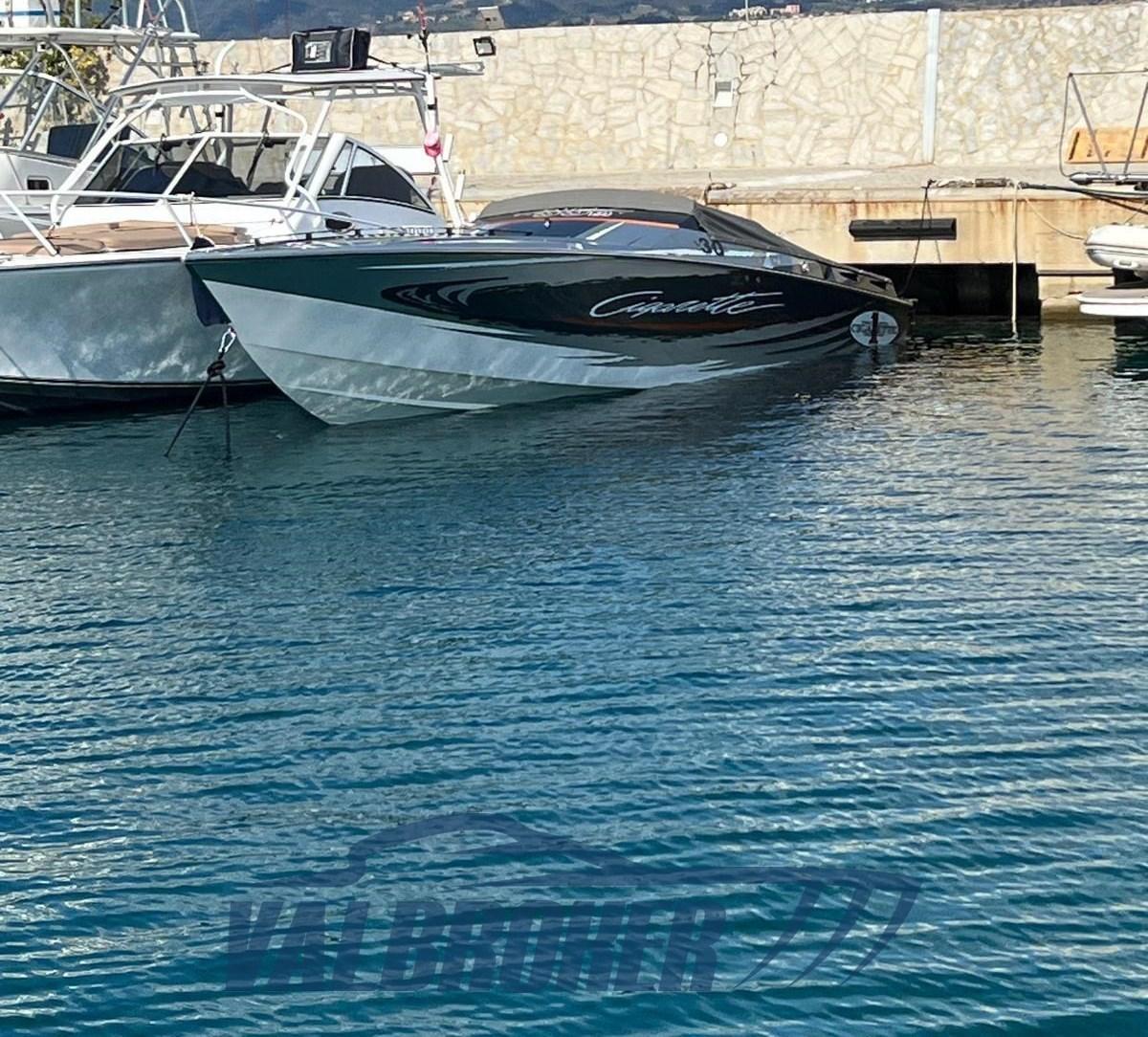 Optionnel : système d’eau douce à circuit fermé. Ordinateur Smartcraft Mercury, commandes moteur Mercury Racing, volets Mercury Racing. Sièges intérieurs en cuir sportif avec logo Cigarette 1, plancher dinette à l’aspect carbone, carénage spécial avec redanse de course. Collecteurs d’échappement à remplacer.