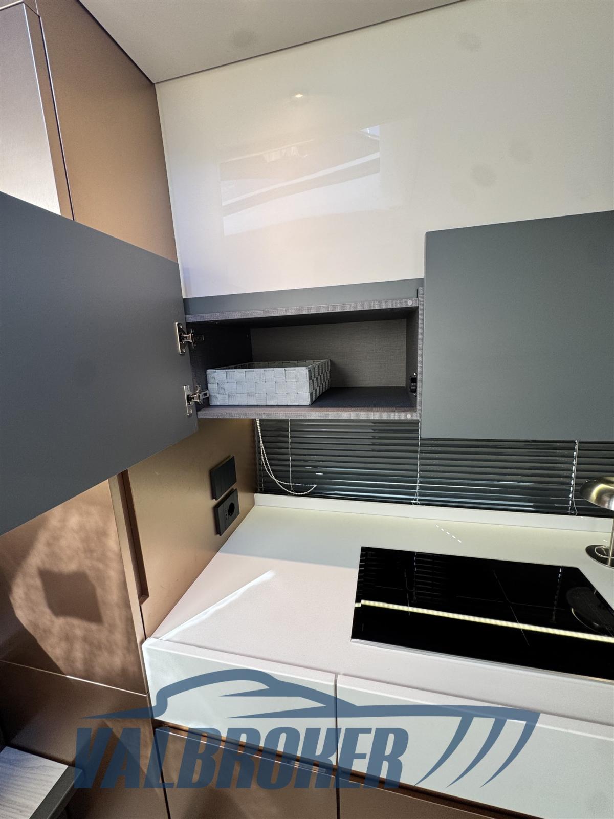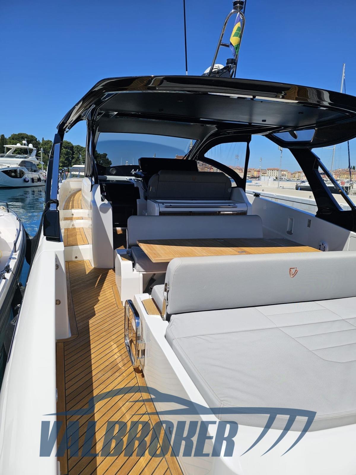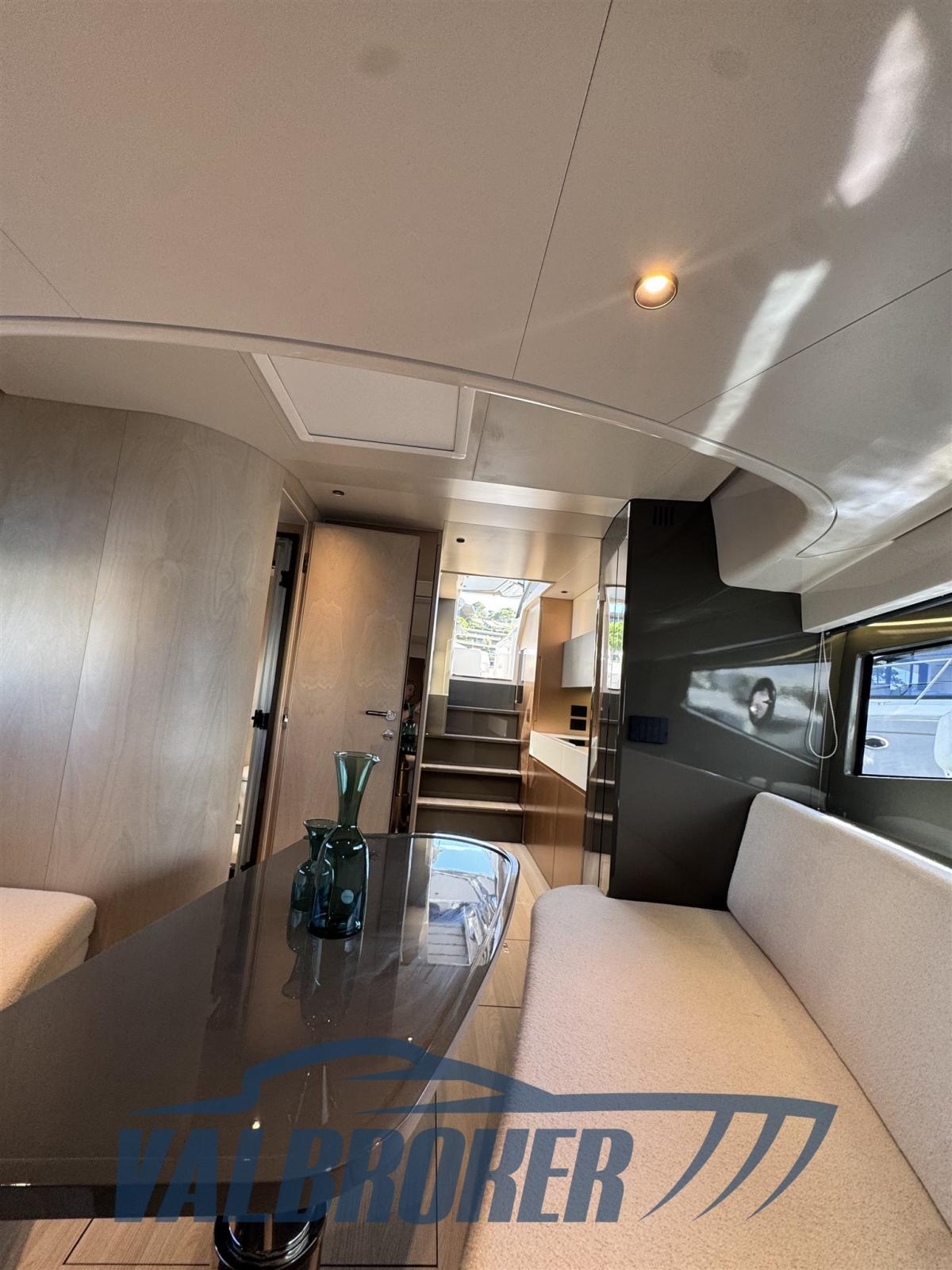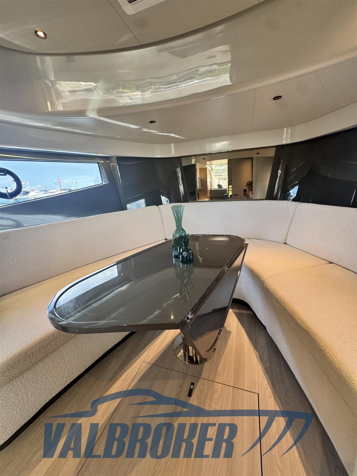 Des lignes captivantes combinées à un grand pare-brise et une excellente circulation de l’air dans le cockpit grâce au toit rigide avec ouverture en lattes. Il offre une grande cabine arrière pleine poutre pour le propriétaire, une élégante salle à manger à l’avant, convertible électriquement en une véritable seconde cabine et deux salles de bains. Les intérieurs sont modernes avec des matériaux luxueux et raffinés. À l’extérieur, l’élégance du design s’accorde parfaitement avec l’esprit sportif de ce nouveau modèle 100 % Made in Italy.