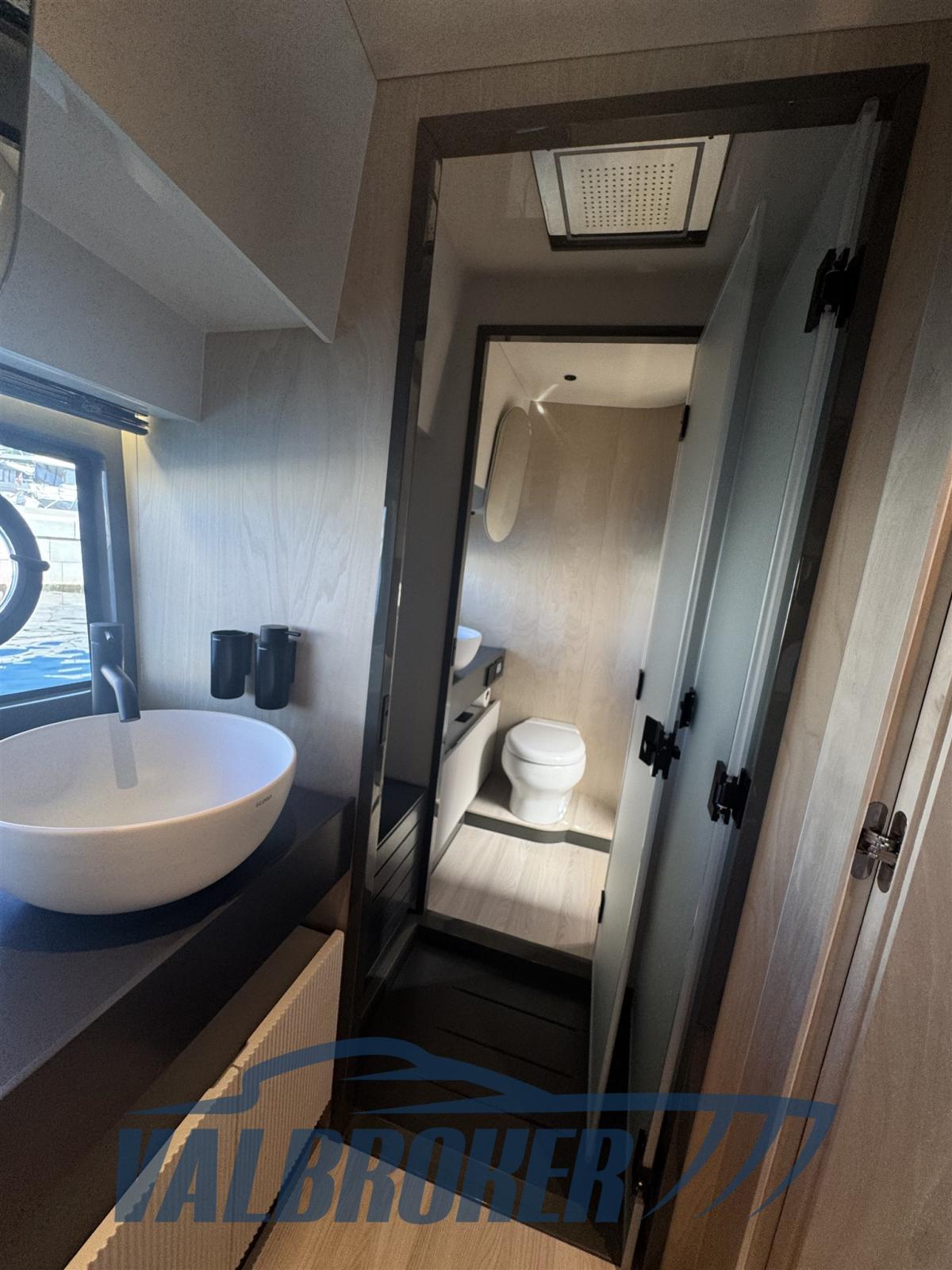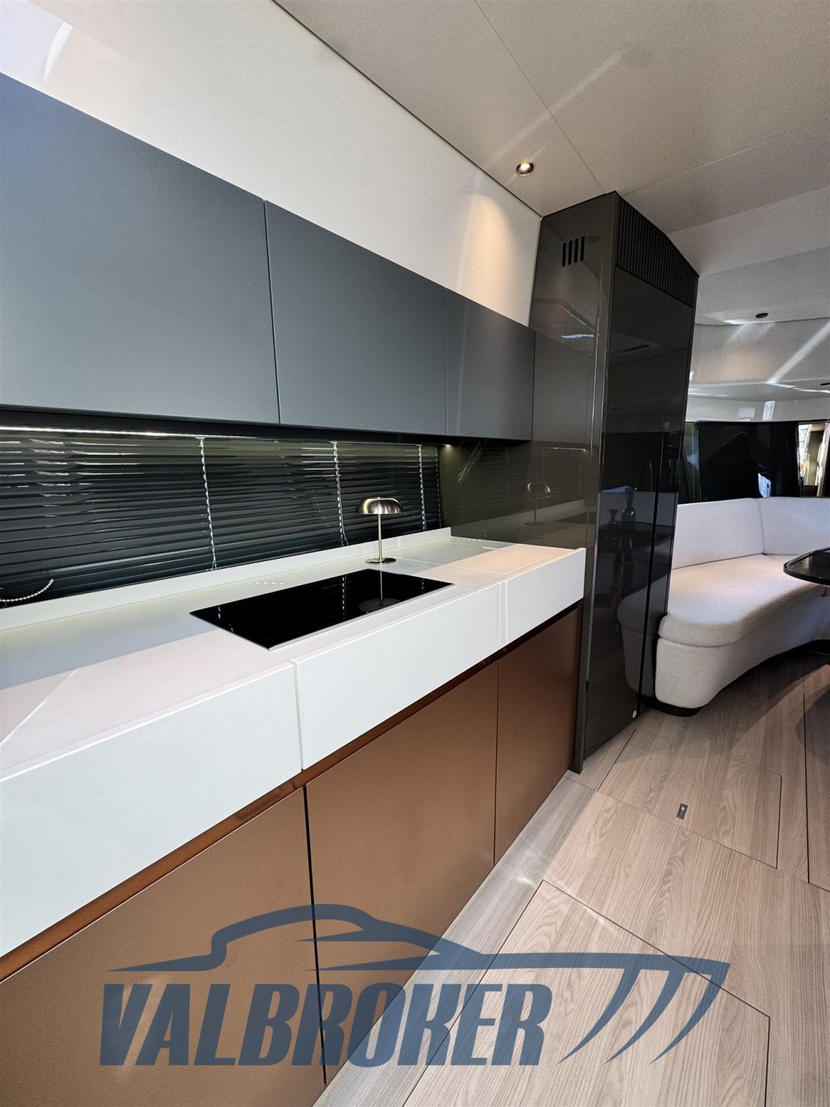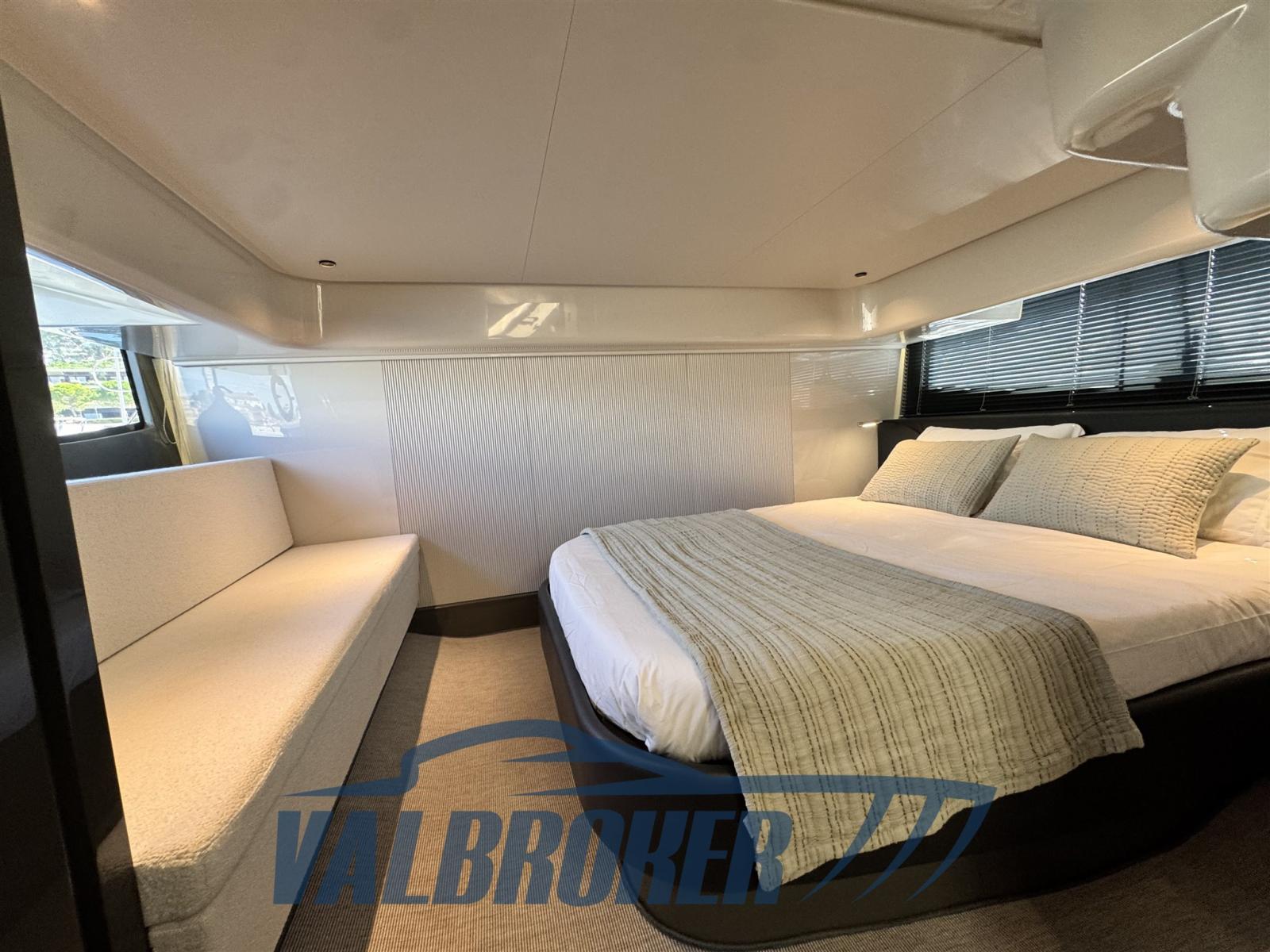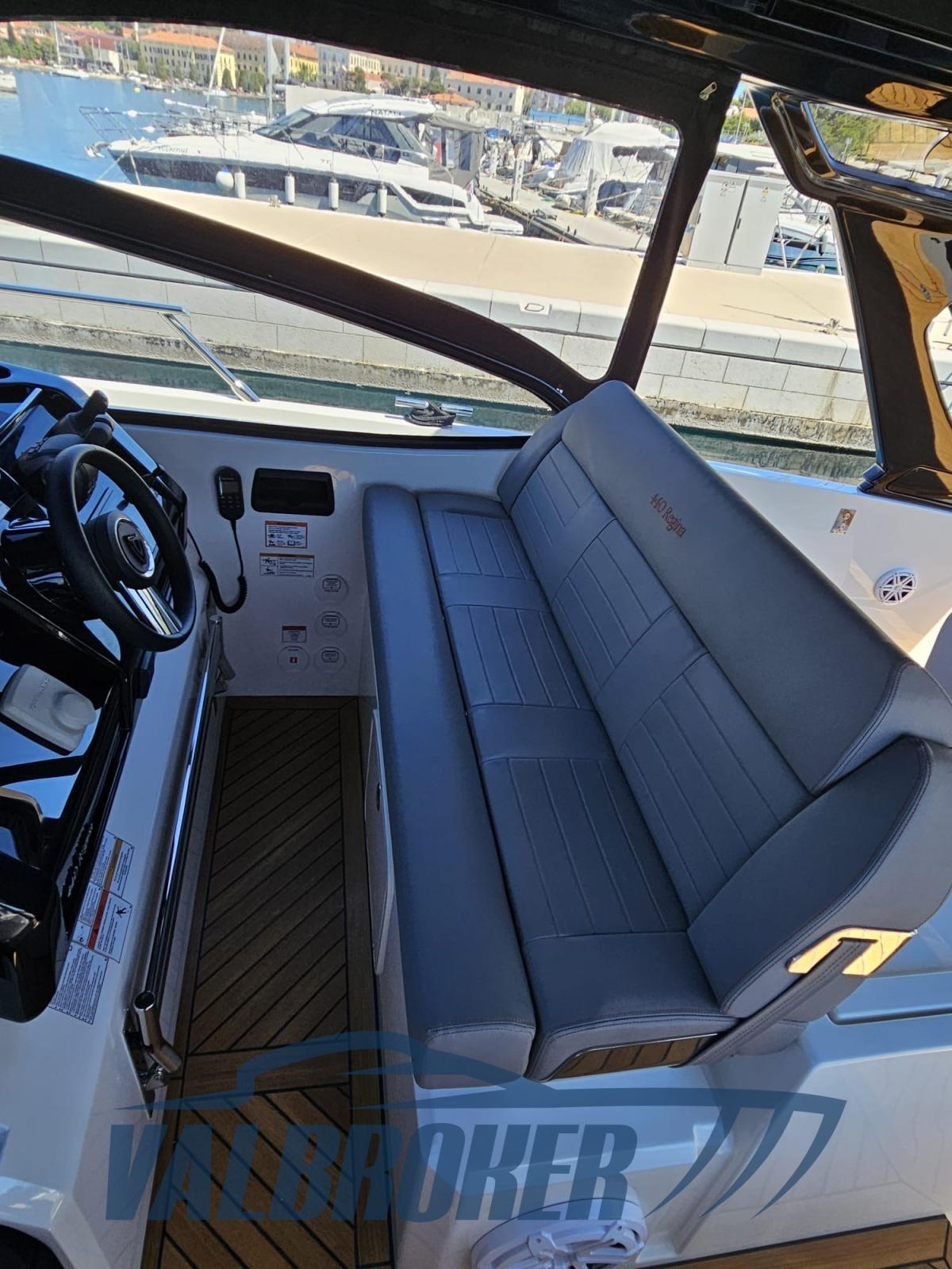 Des lignes captivantes combinées à un grand pare-brise et une excellente circulation de l’air dans le cockpit grâce au toit rigide avec ouverture en lattes. Il offre une grande cabine arrière pleine poutre pour le propriétaire, une élégante salle à manger à l’avant, convertible électriquement en une véritable seconde cabine et deux salles de bains. Les intérieurs sont modernes avec des matériaux luxueux et raffinés. À l’extérieur, l’élégance du design s’accorde parfaitement avec l’esprit sportif de ce nouveau modèle 100 % Made in Italy.