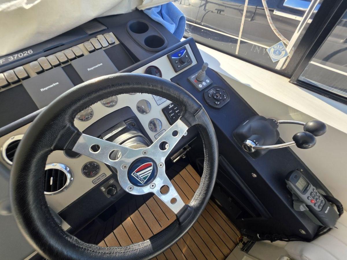 Entièrement équipé : climatisation, générateur, onglet de trim, pilote automatique, GPS/sondeur de profondeur, propulseur d’étrave, cockpit en teck, auvent de camping,