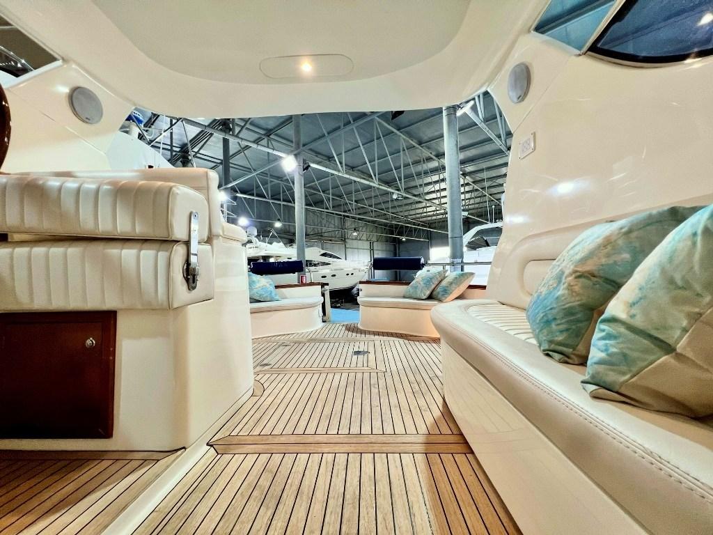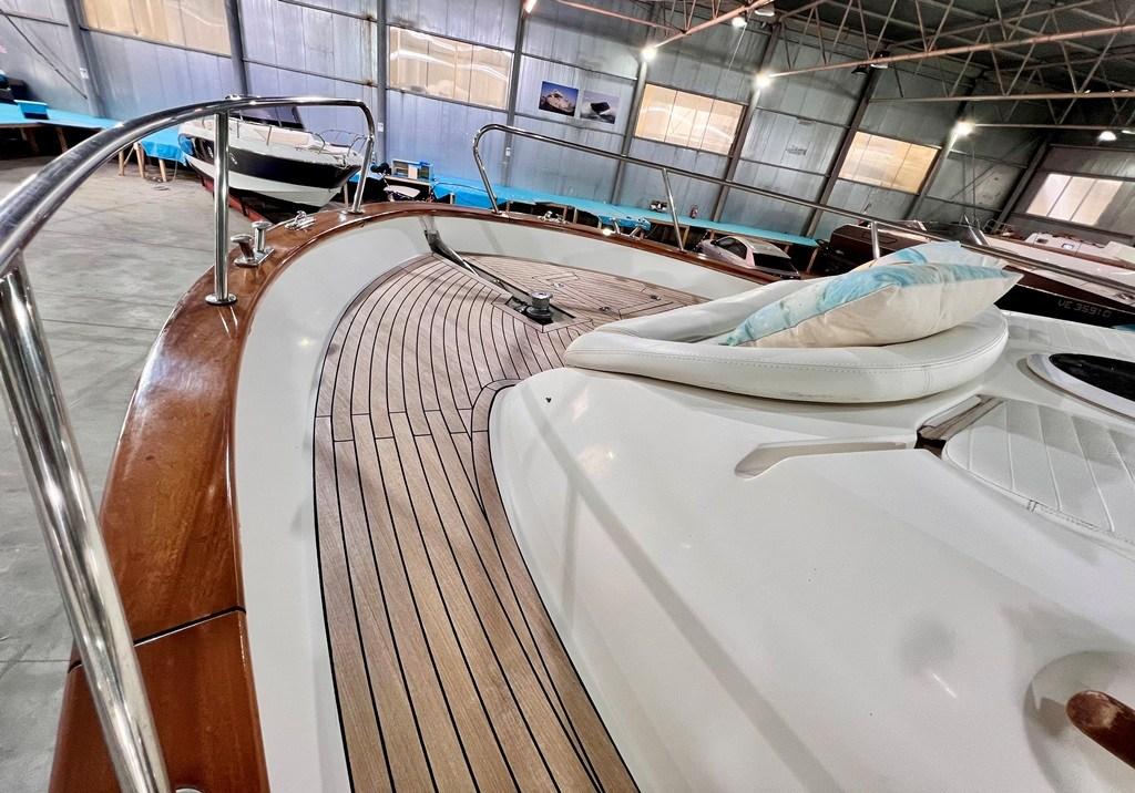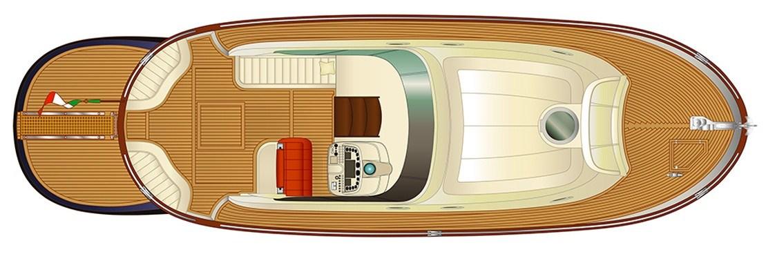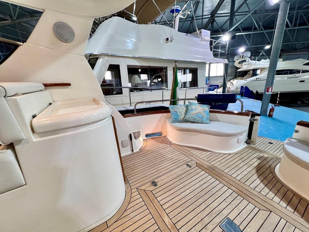 Eau sous pression, Couleur spéciale (Fiancate Blu Navi), Douche de cockpit, Flaps électriques, Hard top (Apribile), Extincteur(s) fixe(s), Plateforme arrière (con calpestio in teach), Pompe de cale automatique, Pont en teck, Porte latérale, Cockpit en teck, Prise de quai, Guindeau électrique, table de cockpit, Table pliante de salon (trasfromabile in cuccetta), Winch électrique avant.