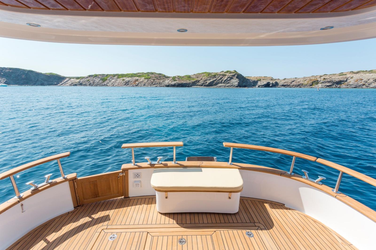 Flaps, ancre Bruce, guindeau électrique, antifouling, balcon et main courante avant en inox avec porte défenses, double trappe d'accès à la cale moteurs, douche extérieure arrière eau chaude et froide, feux de navigation, porte d'accès à la plateforme de bain en teck, plateforme de bain, coffres passavants babord et tribord. Plus de nombreuses options sur commande.