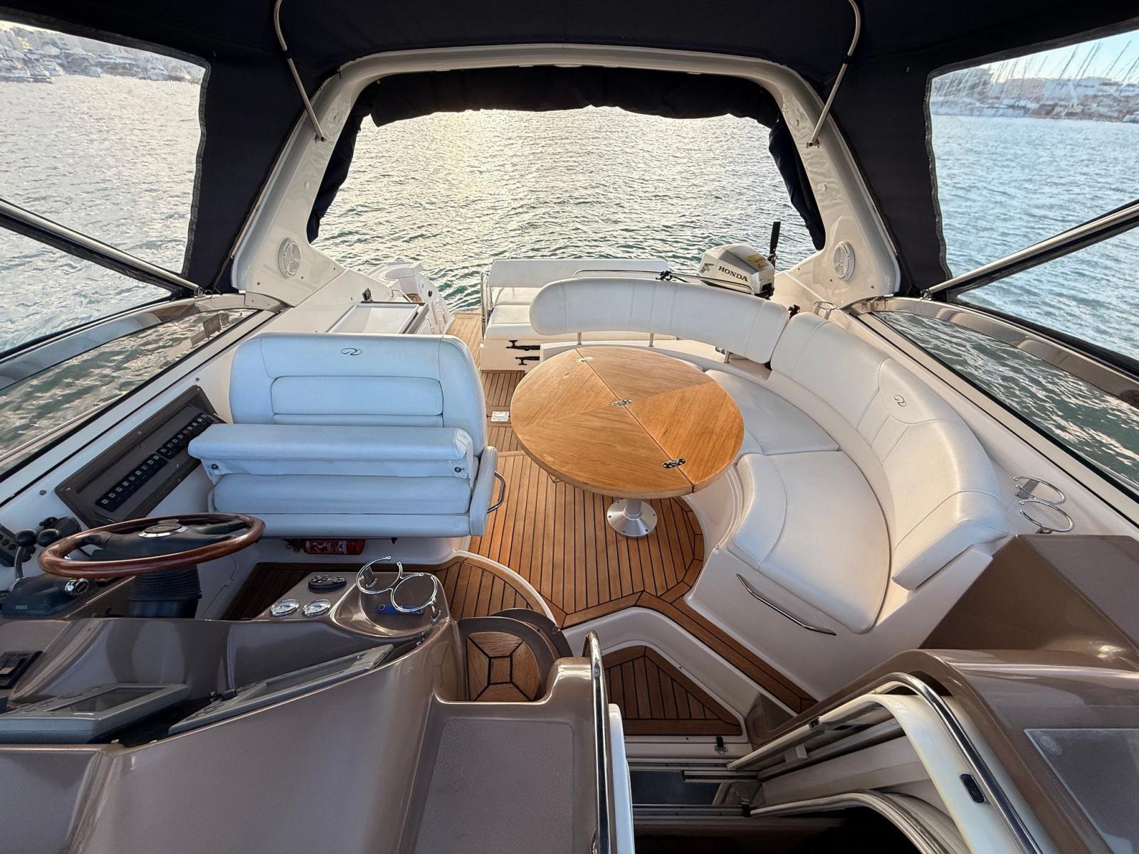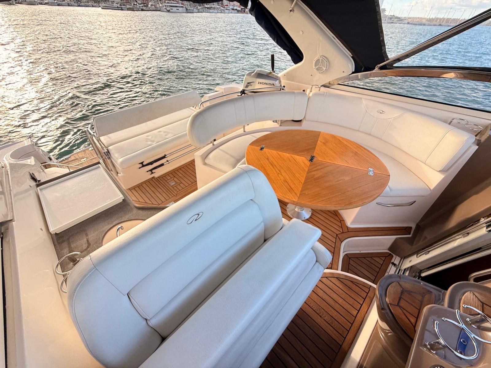 À l’extérieur, un cockpit spacieux avec un grand canapé en forme de U, une table centrale, un réfrigérateur, une cuisinière et un pont de soleil arrière ; Idéal pour la vie en plein air et la croisière côtière.