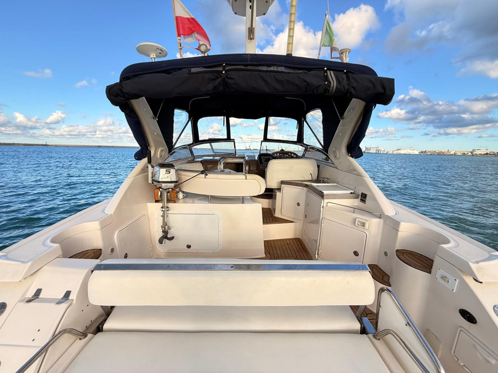 Eau sous pression, 5 Batteries (2025 (2 MOTORI 2 SERVIZI 1 GRUPPO ELETTROGENO)), Câble d’alimentation à quai, Filères, Douche de cockpit, Flaps électriques, Extincteur(s) fixe(s), 2 Panneau solaire, Défenses, Plateforme arrière, Pompe de cale manuelle, Porte latérale, Cockpit en teck, Prise de quai, Connexion eau sous pression à quai, Onduleur, Rollbar, Guindeau électrique, Echelle de bain, Chaise support HB, table de cockpit, Table pliante de salon.