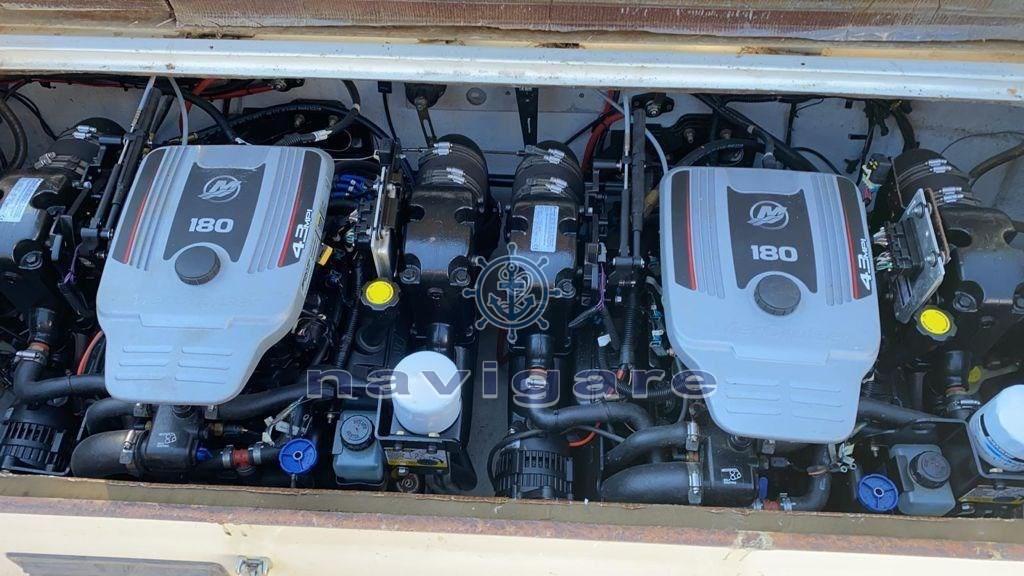 Alarme moteur, Eau sous pression, 6 Batteries (3+3), Chargeur de batterie (QUICK), Câble d’alimentation à quai, Douche de cockpit, Hard top, Éclairage de courtoisie, Pompe de cale automatique, Prise de quai, Guindeau électrique, Echelle de bain, Corne.