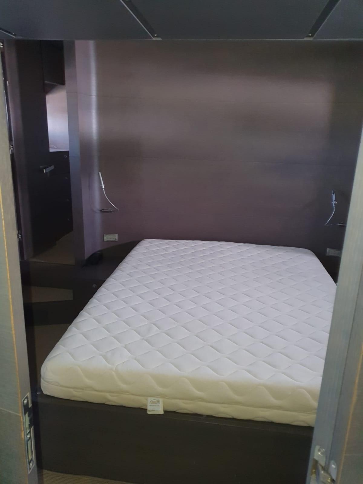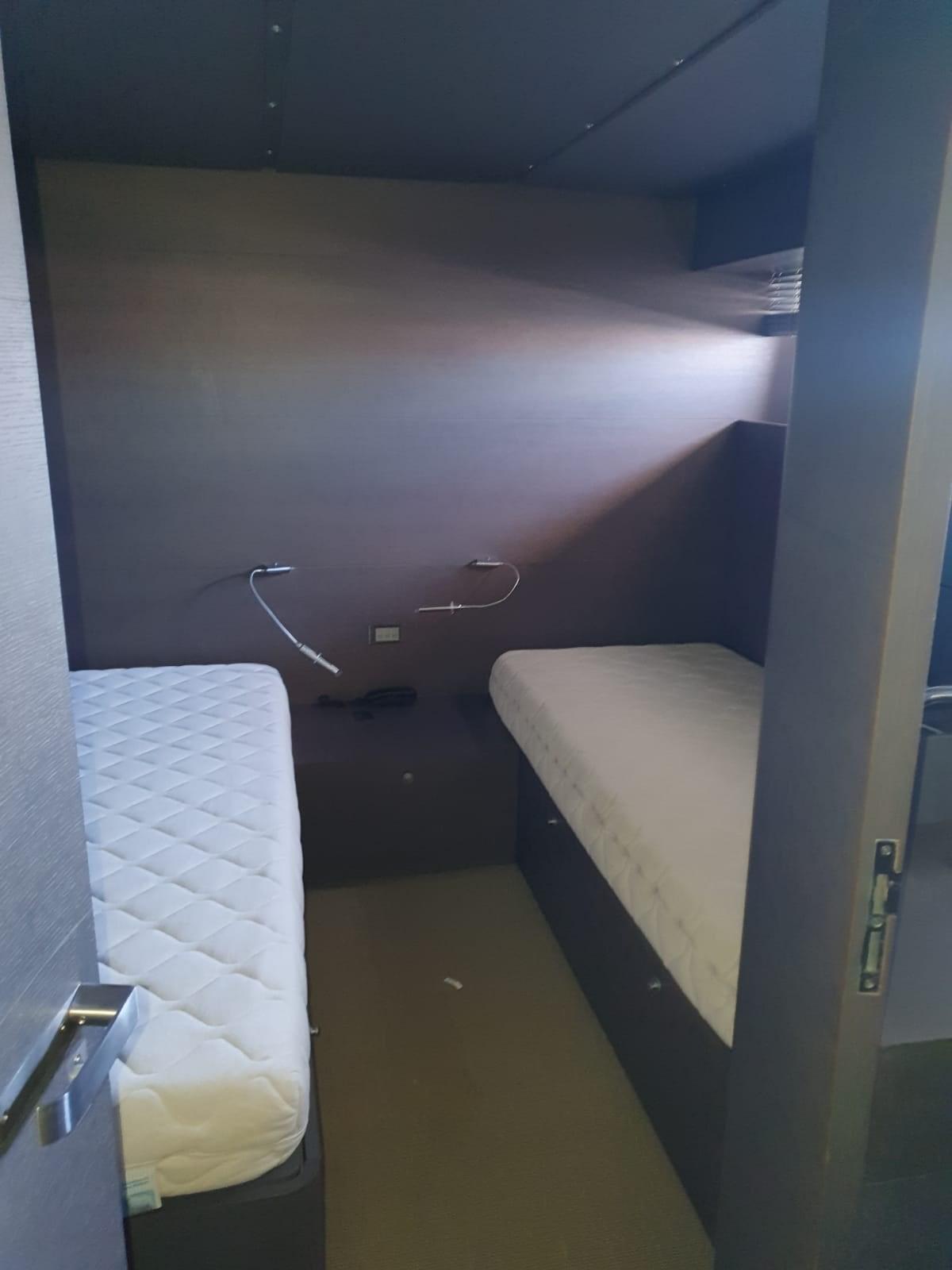 La configuration comprend 4 cabines : une suite propriétaire pleine poutre à l’arrière, une suite VIP à l’avant avec un lit queen-size et deux cabines doubles latérales pour les invités, toutes équipées de salles de bains privées. À la poupe, il y a une cabine d’équipage avec trois couchettes et un accès indépendant, garantissant l’intimité du propriétaire et des invités.