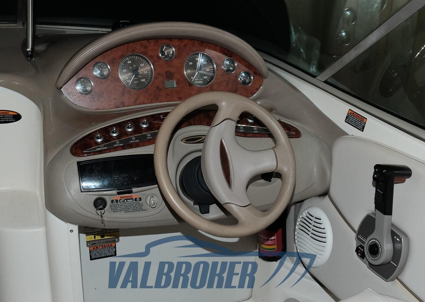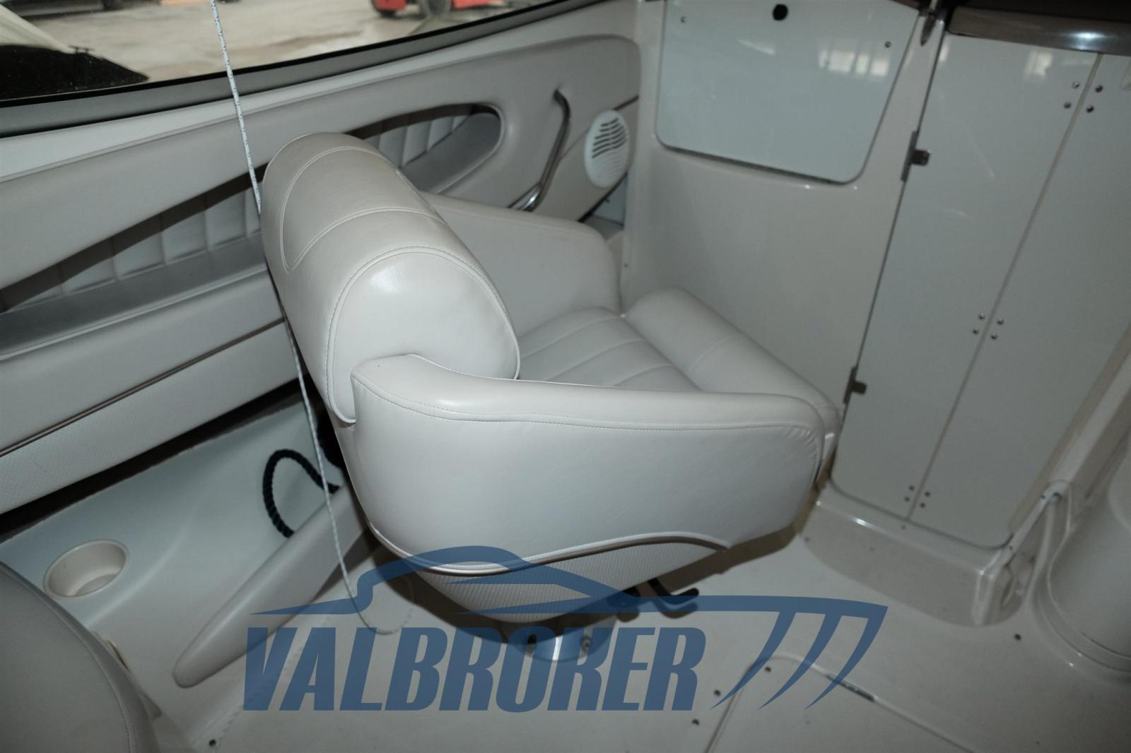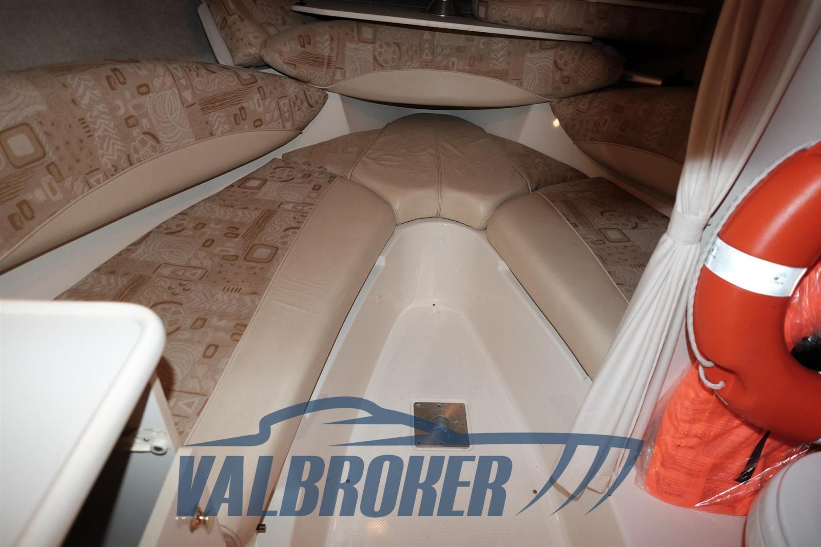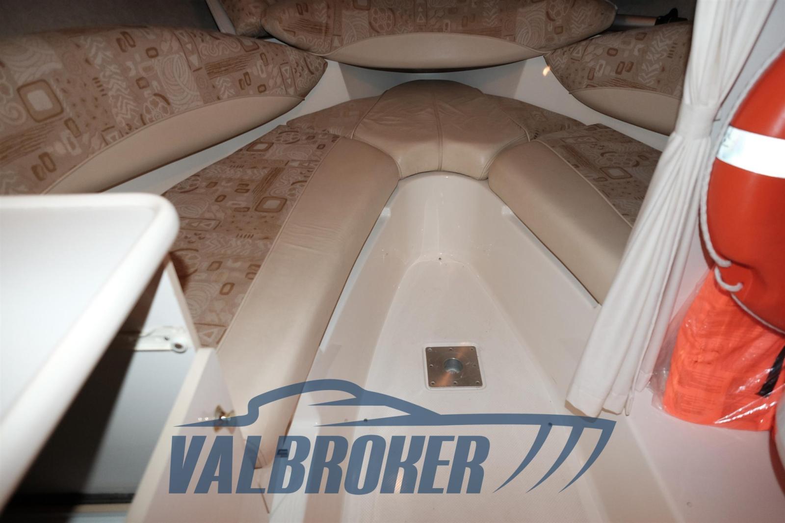 compartiment toilettes, grand bain de soleil à l’avant, équipé d’un réservoir de carburant avec indicateur, panneau utilitaire, feux de navigation