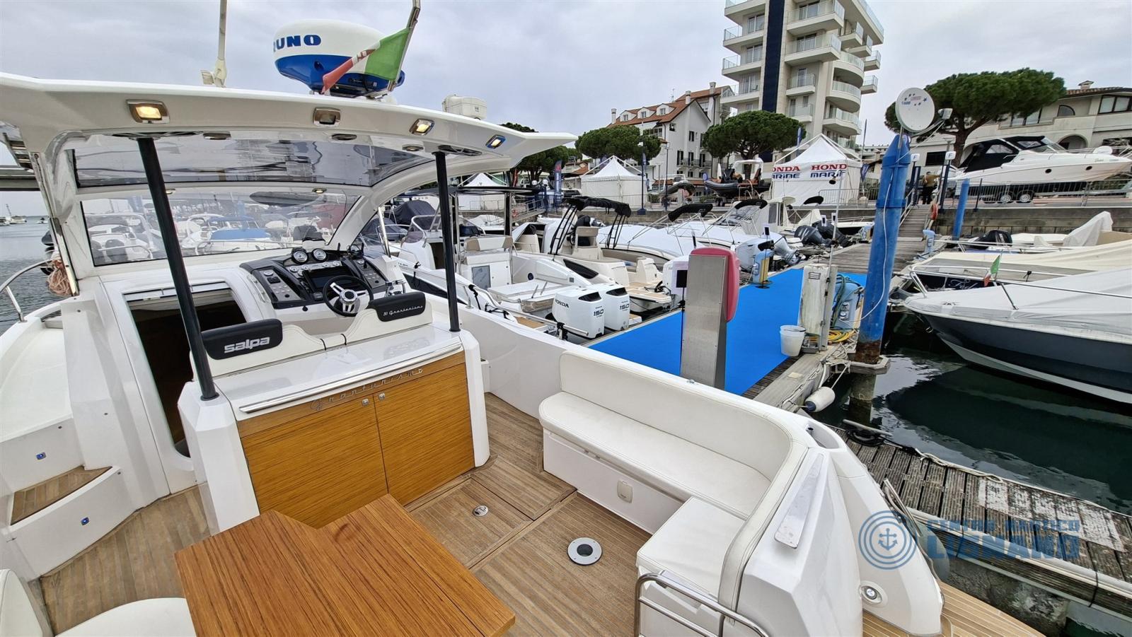 Le yacht Salpa 30 Gran Turismo (GT) est unique en son genre, parfait et prêt pour la saison. Ce bateau, au design moderne et avant-gardiste, mesure 9,90 mètres et fait 10 mètres au total, et à l’intérieur il peut accueillir jusqu’à 4 personnes. La salle de bain est séparée. À l’extérieur, la véritable âme de la 30 GT se révèle : une configuration estivale mais en même temps protégée du vent par un grand toit rigide. Le cockpit est large et spacieux et le nouveau parquet en teck est parfait. Le moteur est enfermé dans une salle des machines propre et soignée et les deux Mercruiser 5.0L MPI sont prêts pour la saison. Moteurs silencieux dans une construction solide et insonorisée. La transmission est un modèle Bravo III à double hélice et propulsion arrière, tout juste révisé et prêt. La 30 GT est un petit yacht pour la famille, rempli d’espace de rangement, de casiers et de casiers. Le bateau est équipé d’un système côtier 220V, d’une instrumentation complète de navigation, de feux colorés de courtoisie et de feux sous-marins pour la nuit.
