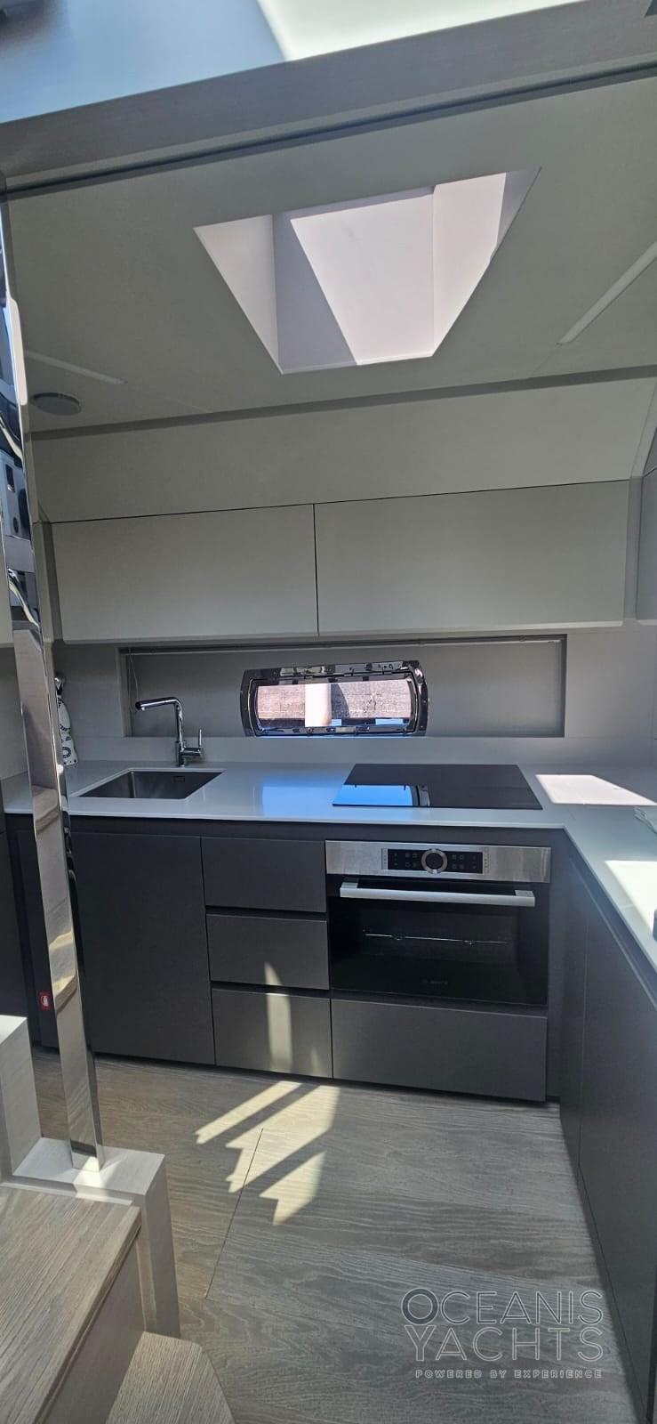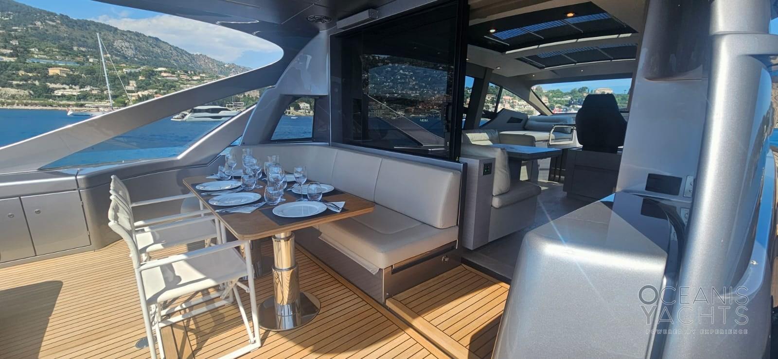 Alarme de pompe de cale, Ancre (Bruce galvanised anchor (50kg)), Eau sous pression, Trim hydraulique, Taquets pliants, Passavant en teck, Câble d’alimentation à quai, Filères, Douche de cockpit, Garage à annexe, Extincteur(s) fixe(s) (Installed in engine room), Éclairage de courtoisie, Spots sous-marins, Défenses, Passerelle (Telescopic hydraulic hideaway gangway (2 remote controls)), Plateforme arrière (Hydraulic lift for tender launch/recovery), Porte latérale, Porte latérale, Prise de quai, Connexion eau sous pression à quai, Echelle de bain, Selles pour Annexe, Stabilisateurs (Seakeeper 6 Gyro), table de cockpit, Table pliante de salon, Annexe, Corne.