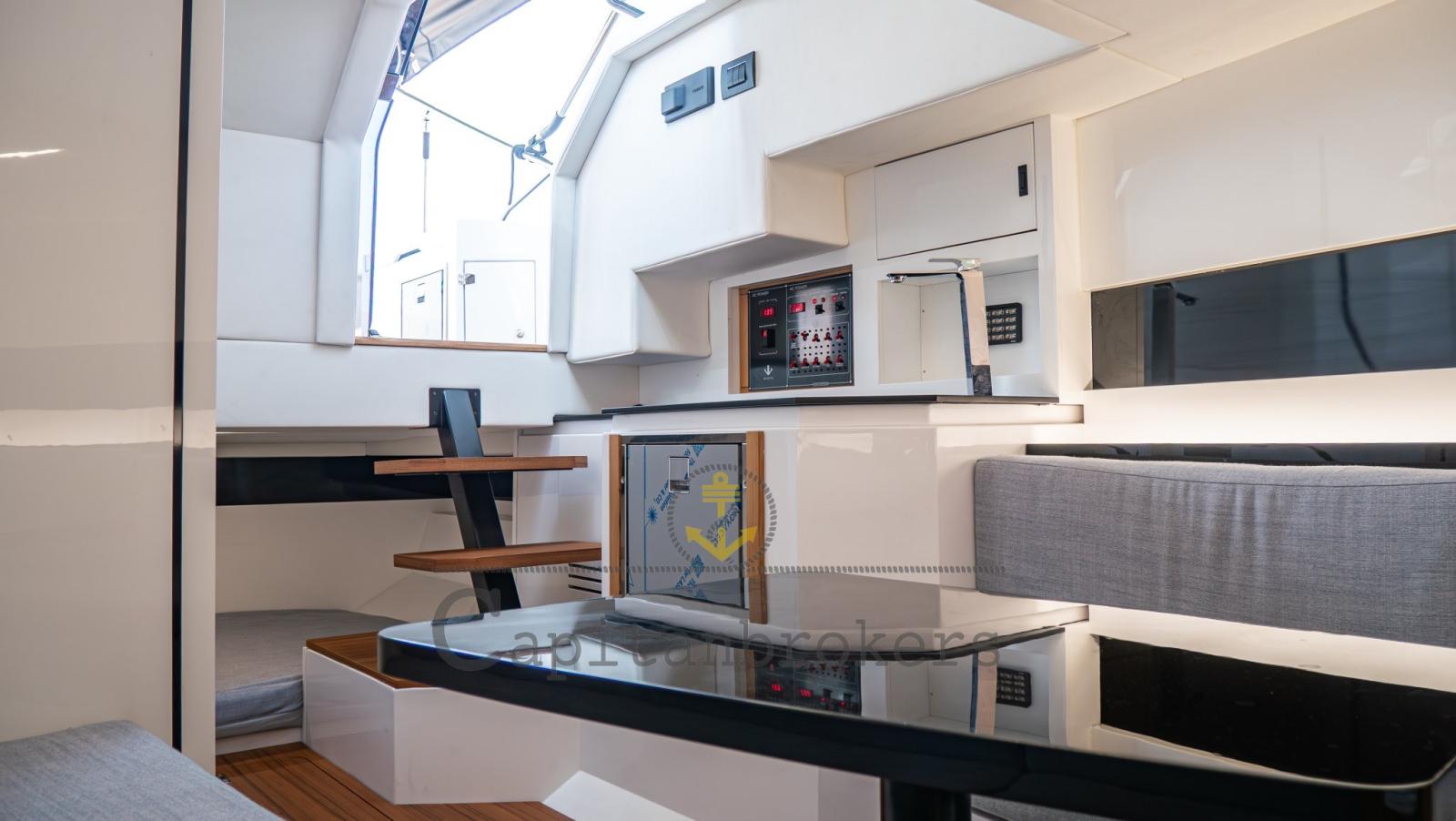 • Grand espace sur le pont avant• Promenade vers le pont avant avec marches• Salon central - avec une grande table• Table de cockpit faite à la main avec pied de table Hi-Lo et coussin de remplissage• Console de pilotage ergonomique avec équipement de navigation et sièges pilotes personnalisés.• Grand bain de soleil arrière avec dossier mobile• Coussin de soleil sur le pont avant*- Rideau*• 2 réfrigérateurs de cockpit sous le siège du bar gauche*• Bimini* • T-TOP*• Prise de cockpit Quai 220 V avec chargeur inclus. Câble d’alimentation à quai*
