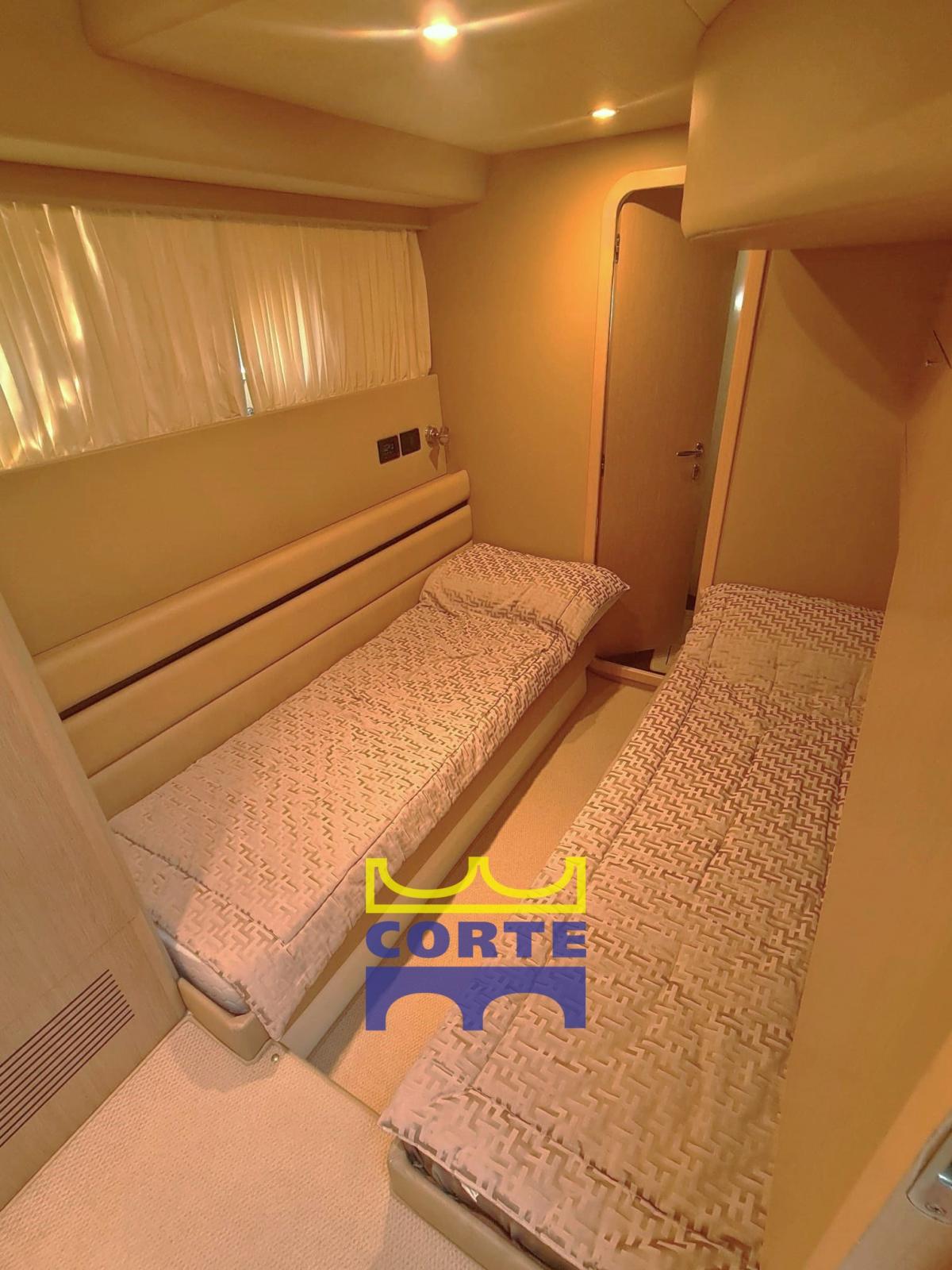 Cabine propriétaire à l’avant avec salle de bain ; Cabine d’invités gauche avec lits plats avec salle de bain ; Cabine d’invités droite avec lits plats avec salle de bain et cabine de douche séparée ; Cabine intérieure de l’équipage avec salle de bain séparée ; Cabine d’équipage arrière avec salle de bain.