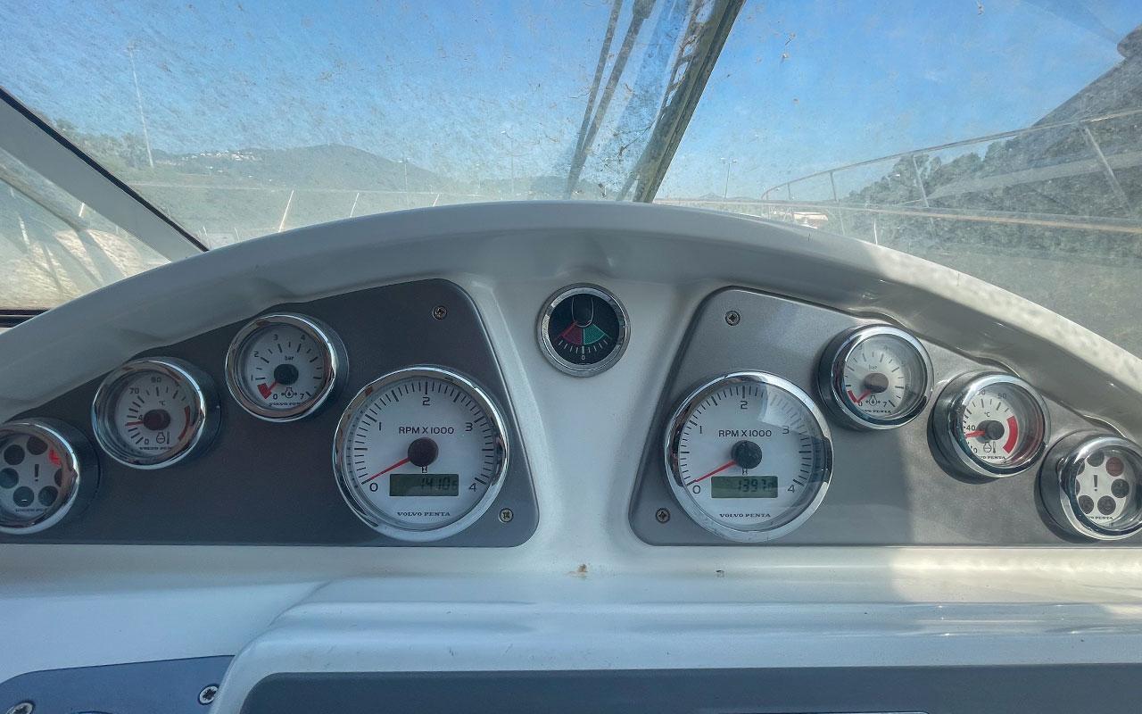 Ce bateau moteur de 11m96 de long et d'une largeur de 3m99 est équipé de 2 moteurs Volvo D6 de 370 CV.