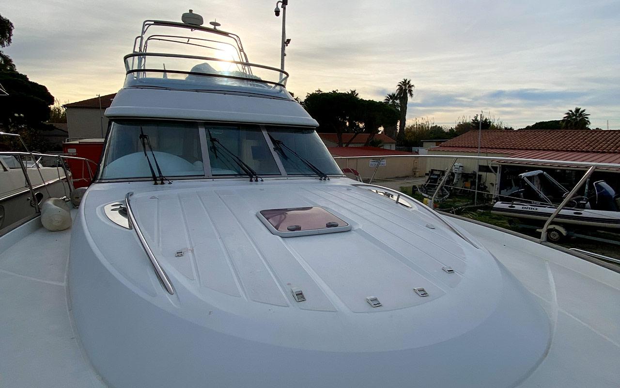 A l'extérieur, cet Antares 12 dispose d'un cockpit arrière vaste et sécurisant, on peut facilement se déplacer vers l'avant du bateau via des passavant présents de chaque côté du bateau. Le pont avant dispose quant à lui d'un vaste espace bain de soleil. De puis le cockpit, on peut se rendre sur le flybridge via un escalier en bois. Le flybridge comporte un poste de pilotage avec une vue dégagée à 360°, là aussi vous trouverez des bains de soleil.