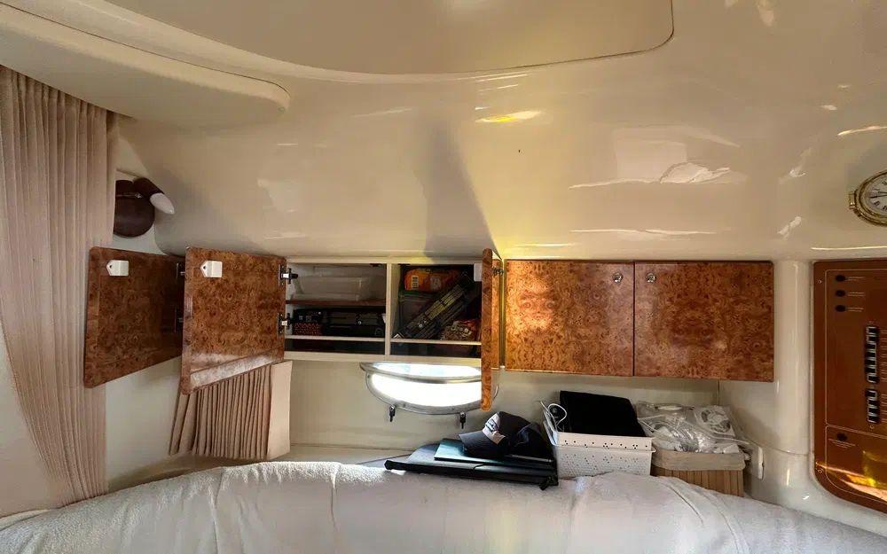 Les équipements extérieurs comprennent des tauds repris récemment, un bimini, une grande bâche d’hivernage, une douchette de pont et un bain de soleil arrière confortable. L’ensemble de la sellerie d’origine est en excellent état, protégée et bien conservée.