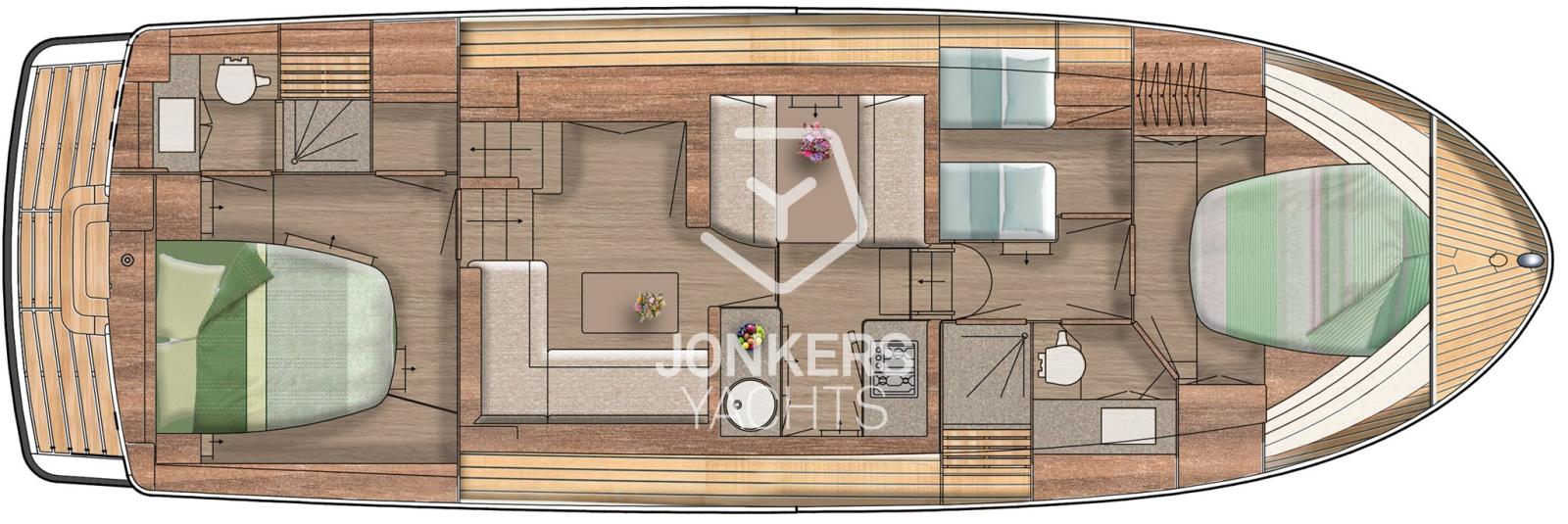 Un point fort clé de cette nouvelle génération est l’introduction de deux schémas de couleurs intérieurs exclusifs : Sandstone Serenity et Olive Grove. Ces palettes soigneusement sélectionnées apportent une ambiance fraîche et contemporaine. Sandstone Serenity offre une atmosphère légère, calme et élégante avec des tons naturels doux, tandis qu’Olive Grove crée un intérieur plus chaleureux et plus riche, avec des teintes plus profondes et un caractère plus classique et accueillant. Les deux styles sont conçus avec des matériaux de haute qualité et des finitions raffinées, rehaussant confort et esthétique sur tout le yacht.