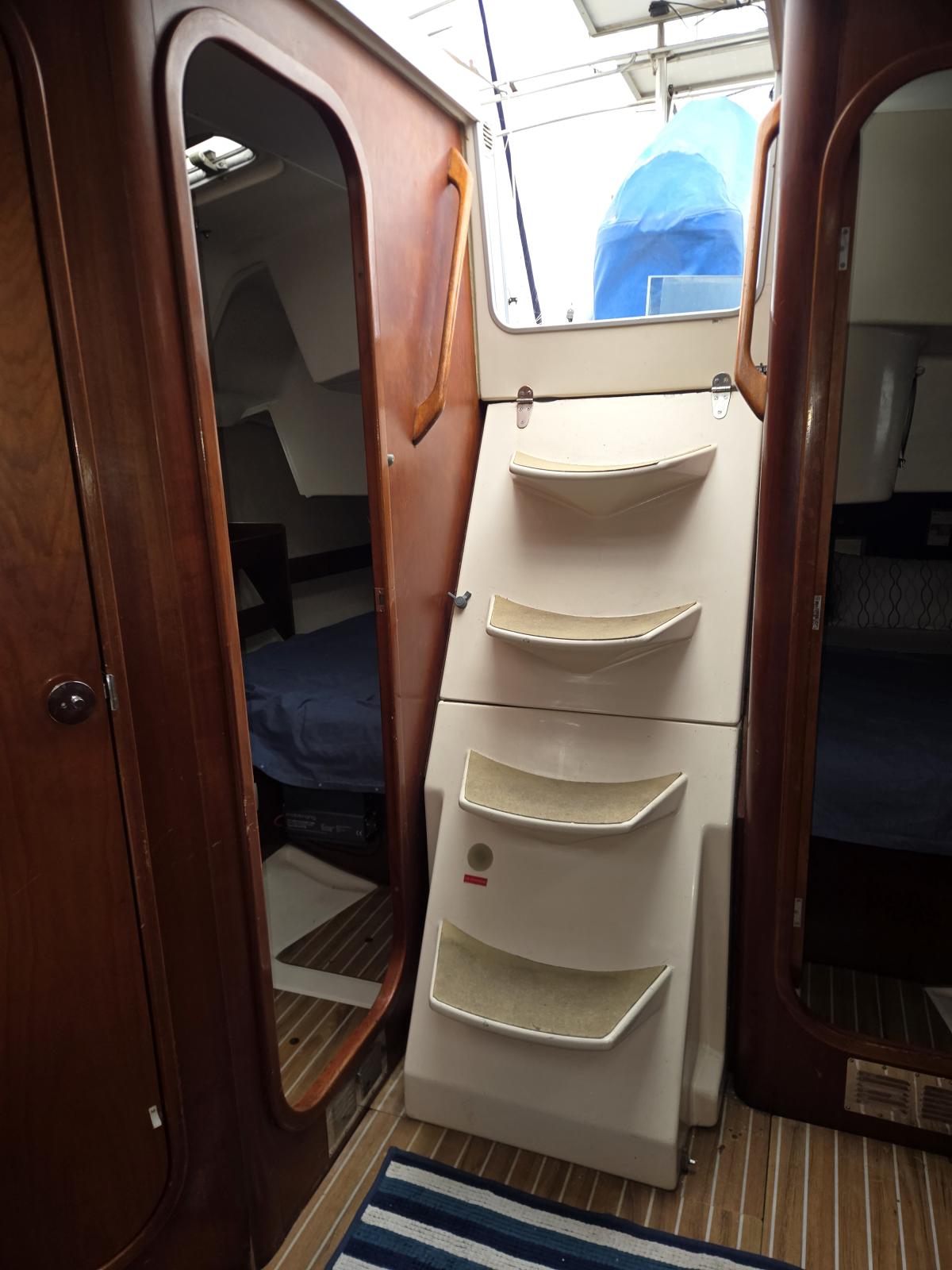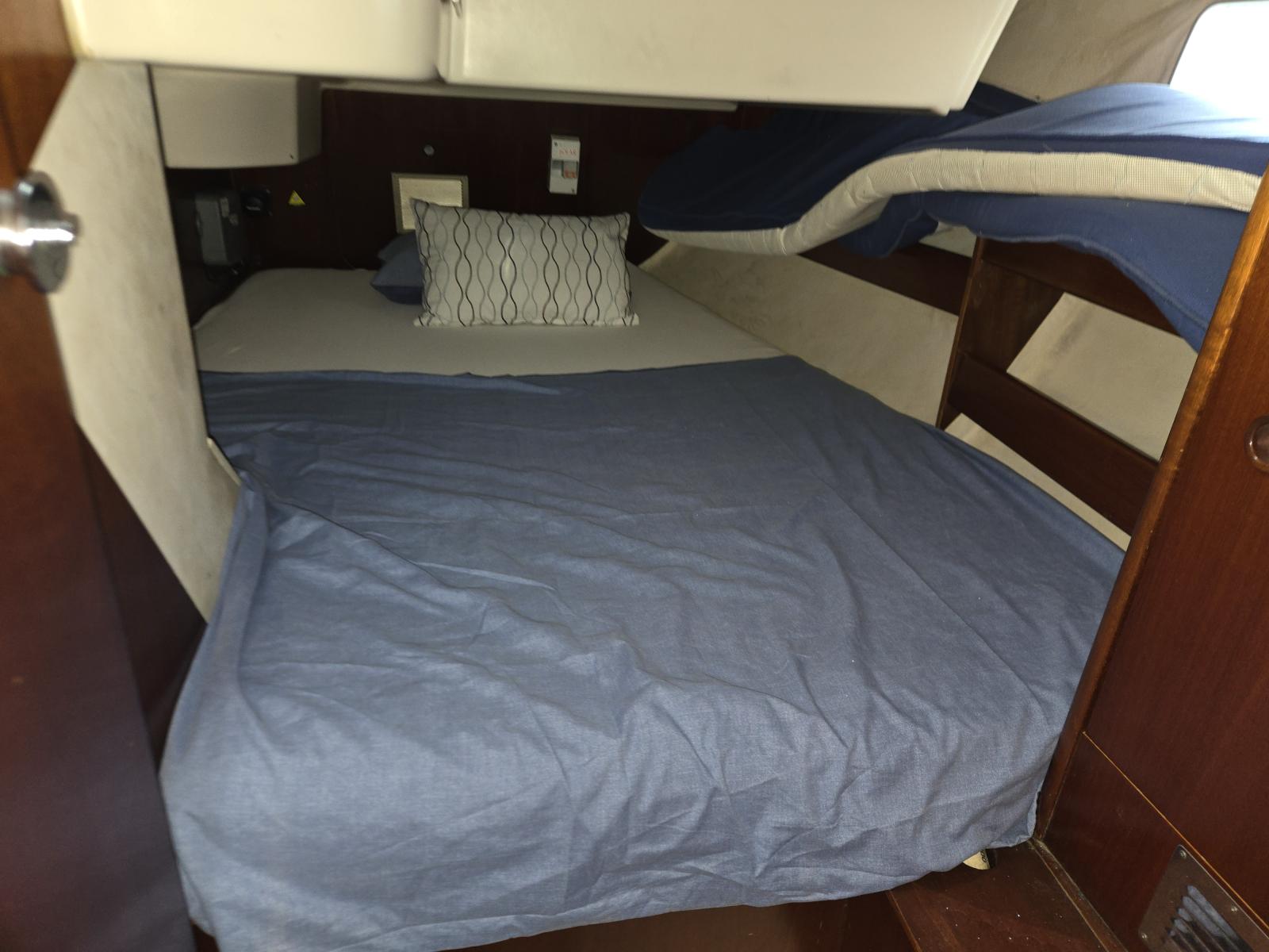 Son intérieur est étonnamment spacieux pour sa longueur. Grand carré avec cuisine, trois cabines et une salle de bain complète. Grand réfrigérateur à compresseur. Cuisine équipée d'un four. Cabine propriétaire à l'avant et deux cabines à l'arrière.