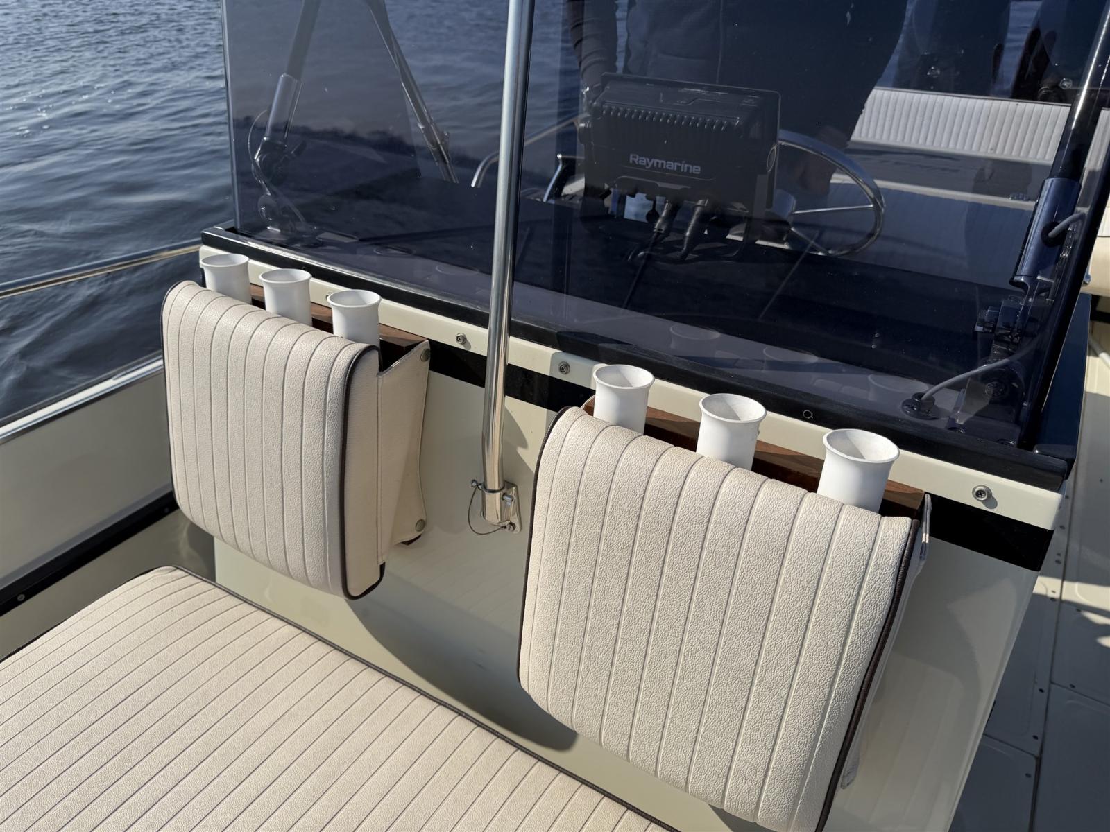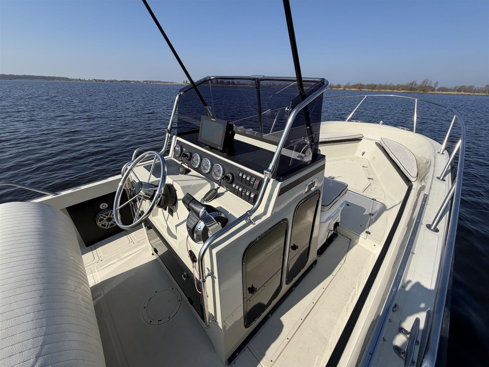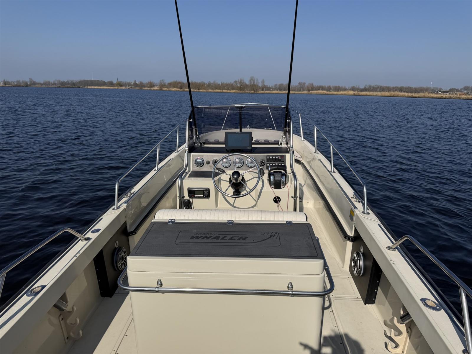 L’aménagement est pratique et spacieux, idéal pour une croisière confortable en journée, des sports nautiques, la pêche ou des journées détentes en famille et entre amis. En même temps, il offre la conduite solide et assurée pour laquelle le Boston Whaler est connu.