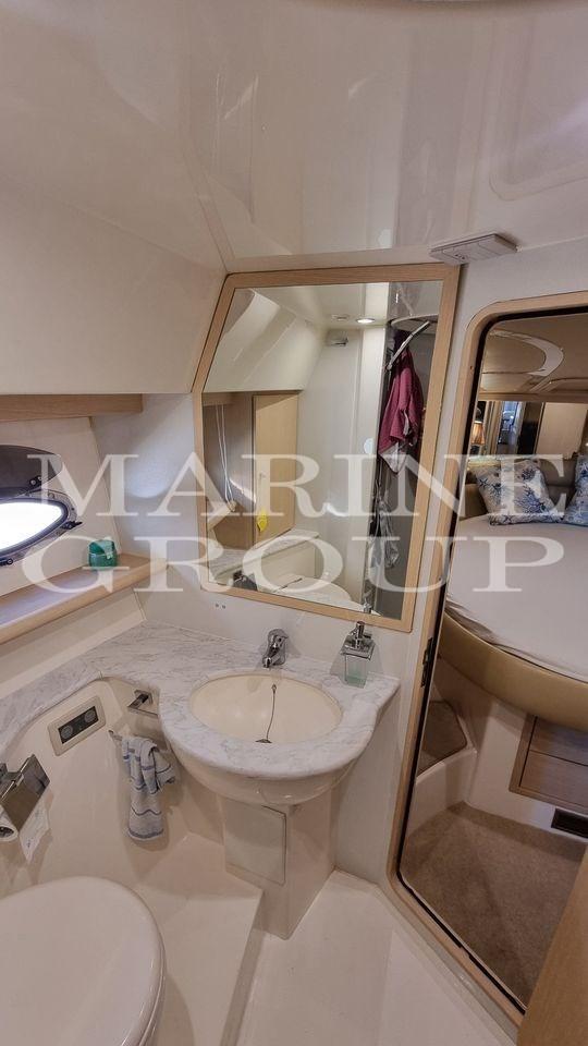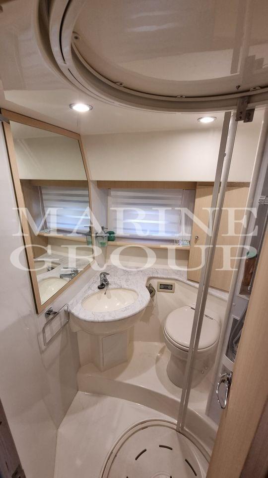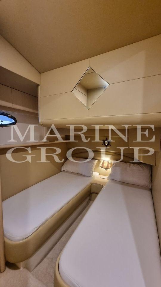 Canapés en cuir blanc enveloppés en chêne clair ; poste de pilotage ; cuisine sur mesure avec appareils de type civil et réfrigérateur de 140 cm de haut ; Cabine du propriétaire à l’avant avec lit double et salle de bain attenante ; Cabine d’amis avec lits simples plats ; troisième cabine avec lits superposés ; Deuxième salle de bain complète avec deux accès.