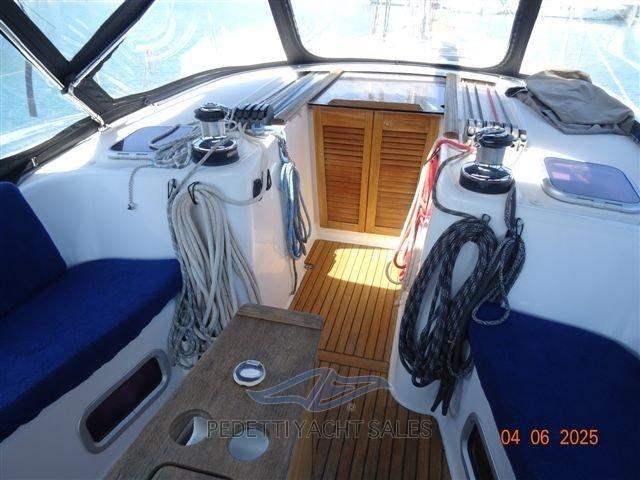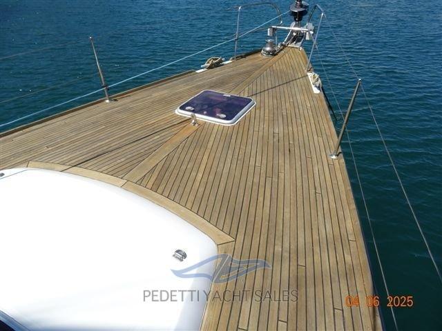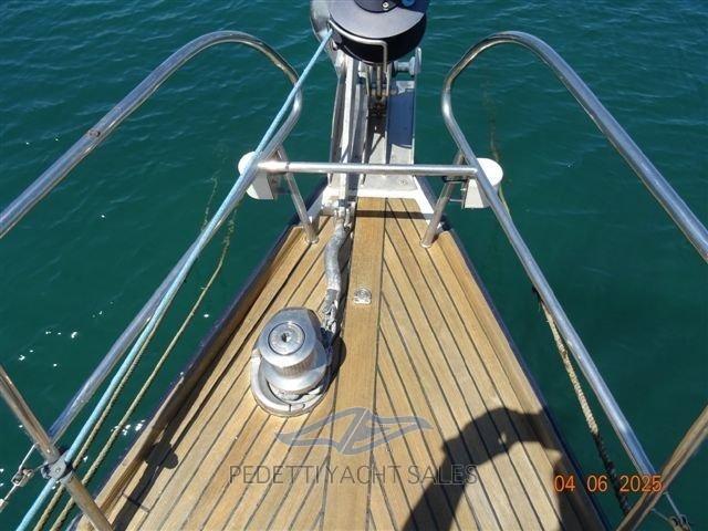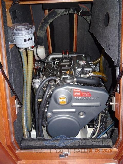 Du point de vue de la propulsion, le bateau est équipé d’un moteur Yanmar de 110 ch, avec environ 1360 heures d’utilisation et une puissance diesel. L’entretien comprend à la fois des interventions ordinaires et extraordinaires. Le système de transmission est direct, avec une hélice pliante à trois pales, une solution qui améliore les performances en voile. Les réservoirs de carburant, en acier, ont une capacité totale de 450 litres.