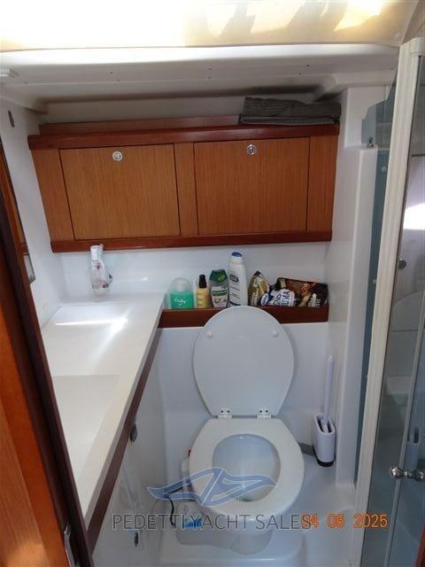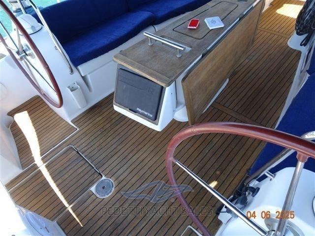 Alarme moteur, Alarme de pompe de cale, Alternateur, Eau sous pression, Douche de cockpit, Double barre à roue, Plateforme arrière, Pompe de cale manuelle, Cockpit en teck, Prise de quai, Onduleur, Guindeau électrique, Echelle de bain.