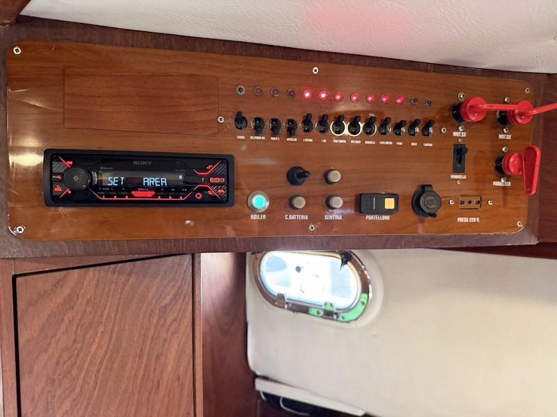 Feux de navigation ; Feu d’ancre ; Phare réglable ; Encore une fois ; Treuil à guindeau électrique ; Trompette ; Couverture du cockpit ; Teck dans le cockpit ; pont en teck ; quai arrière ; Douche dans le cockpit ; Échelle de nage ; Des volets ; Frigo ; Évier de cuisine ; Toilettes électriques ; Pompes de cale automatiques ; Pompe de cale manuelle ; Batteries ; Charger ; Déconnexion de batterie ; Prise 220V ; Coussins de cockpit ; Coussins de pont ouvrant à l’avant ; Couvercle du tableau de bord ; Chaudière ; Enceintes du cockpit ; Des ailes ; Crochet de Bateau