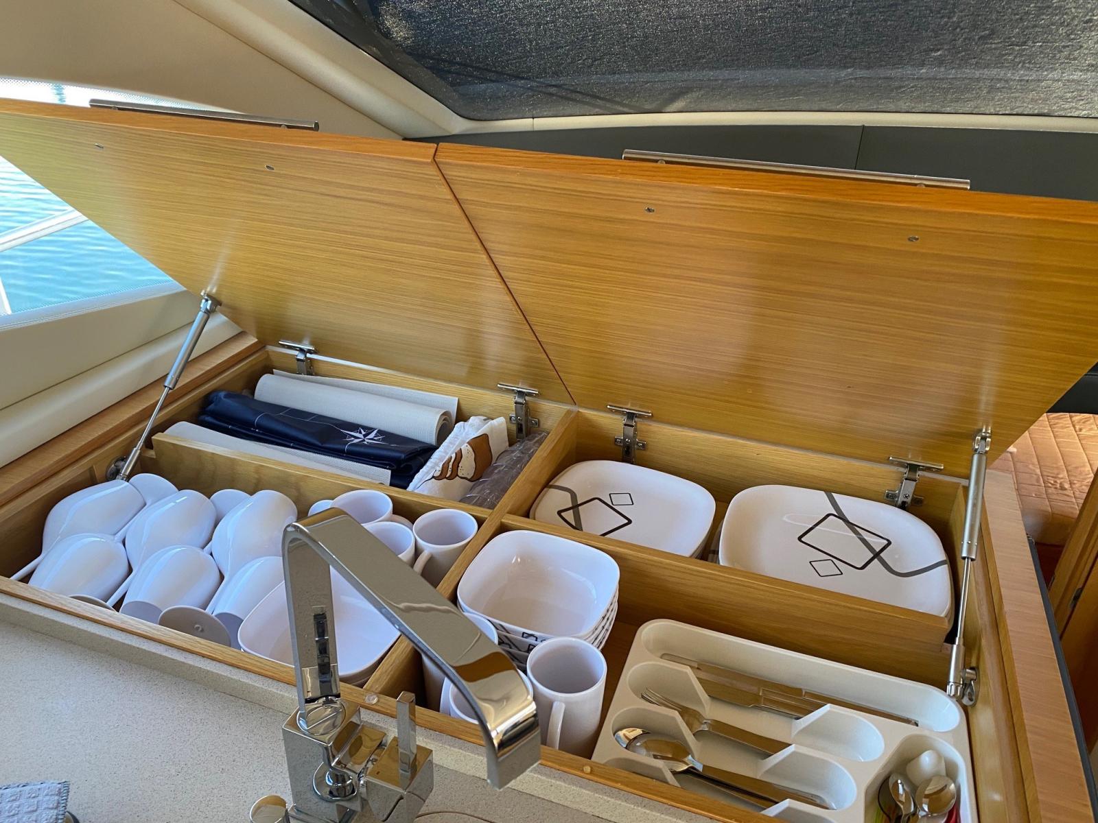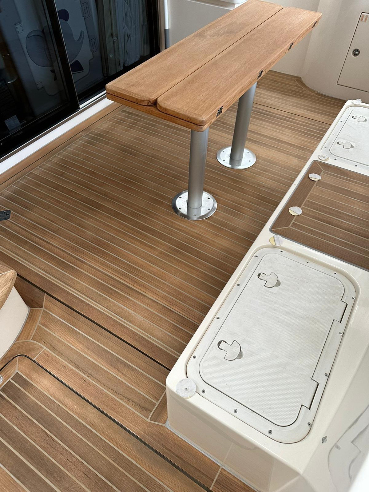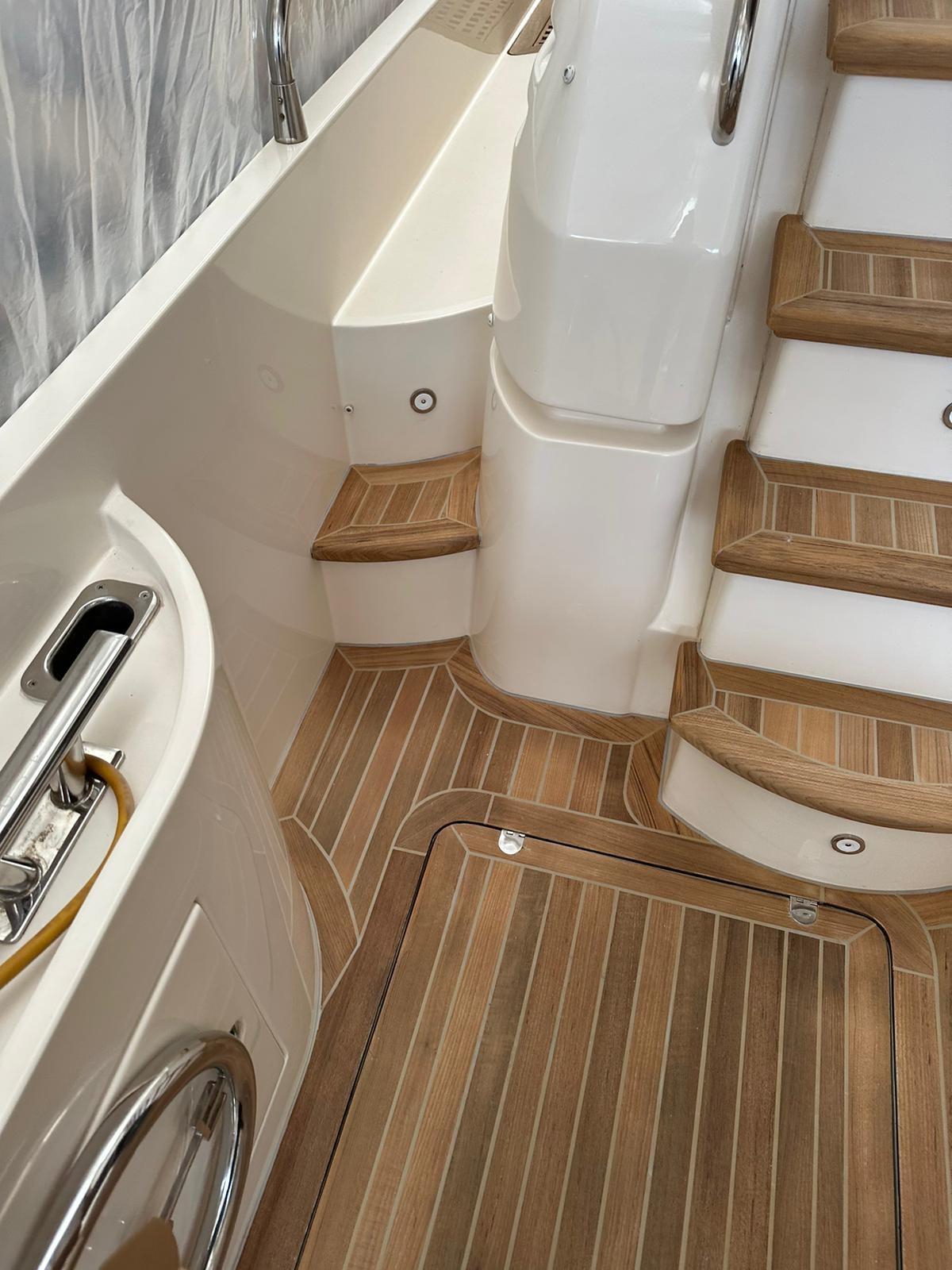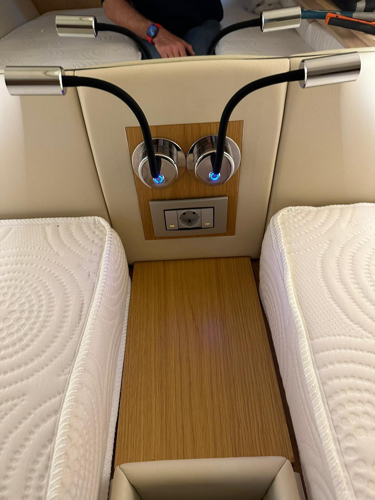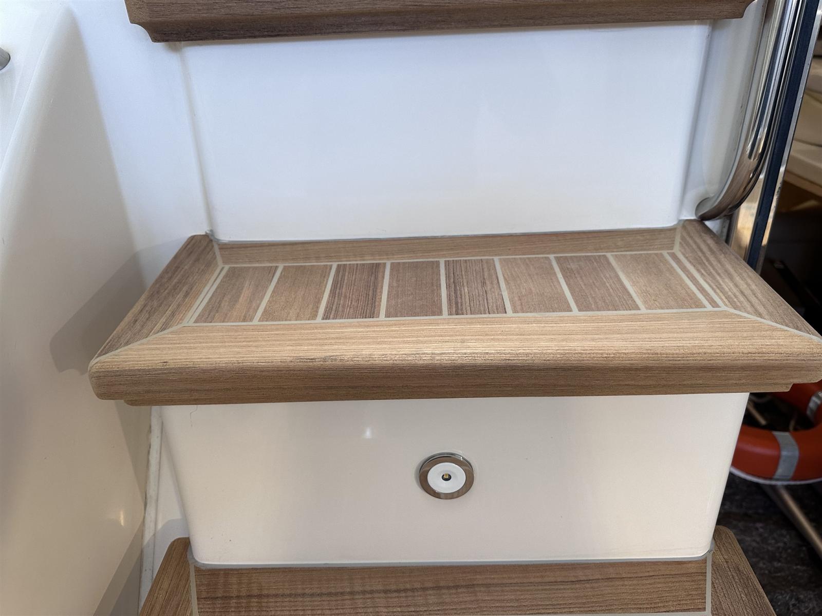 Alarme moteur, Alarme de pompe de cale, Eau sous pression, Passavant en teck, Douche de cockpit, Flaps électriques, Extincteur(s) fixe(s), Indicateurs de flaps, Plateforme arrière, Pompe de cale automatique, Cockpit en teck, Prise de quai, Onduleur, Guindeau électrique, Echelle de bain, Corne.