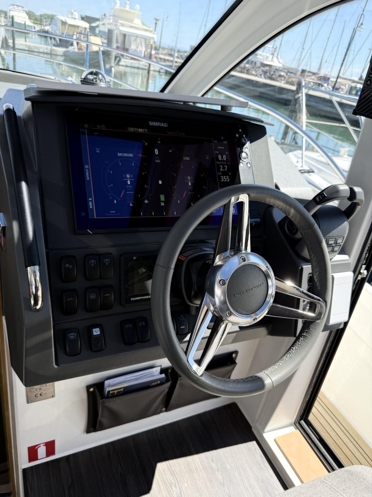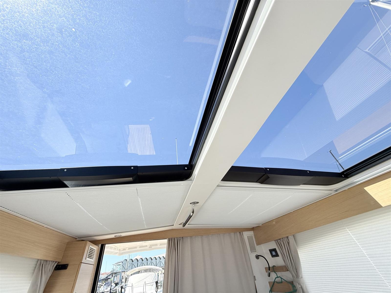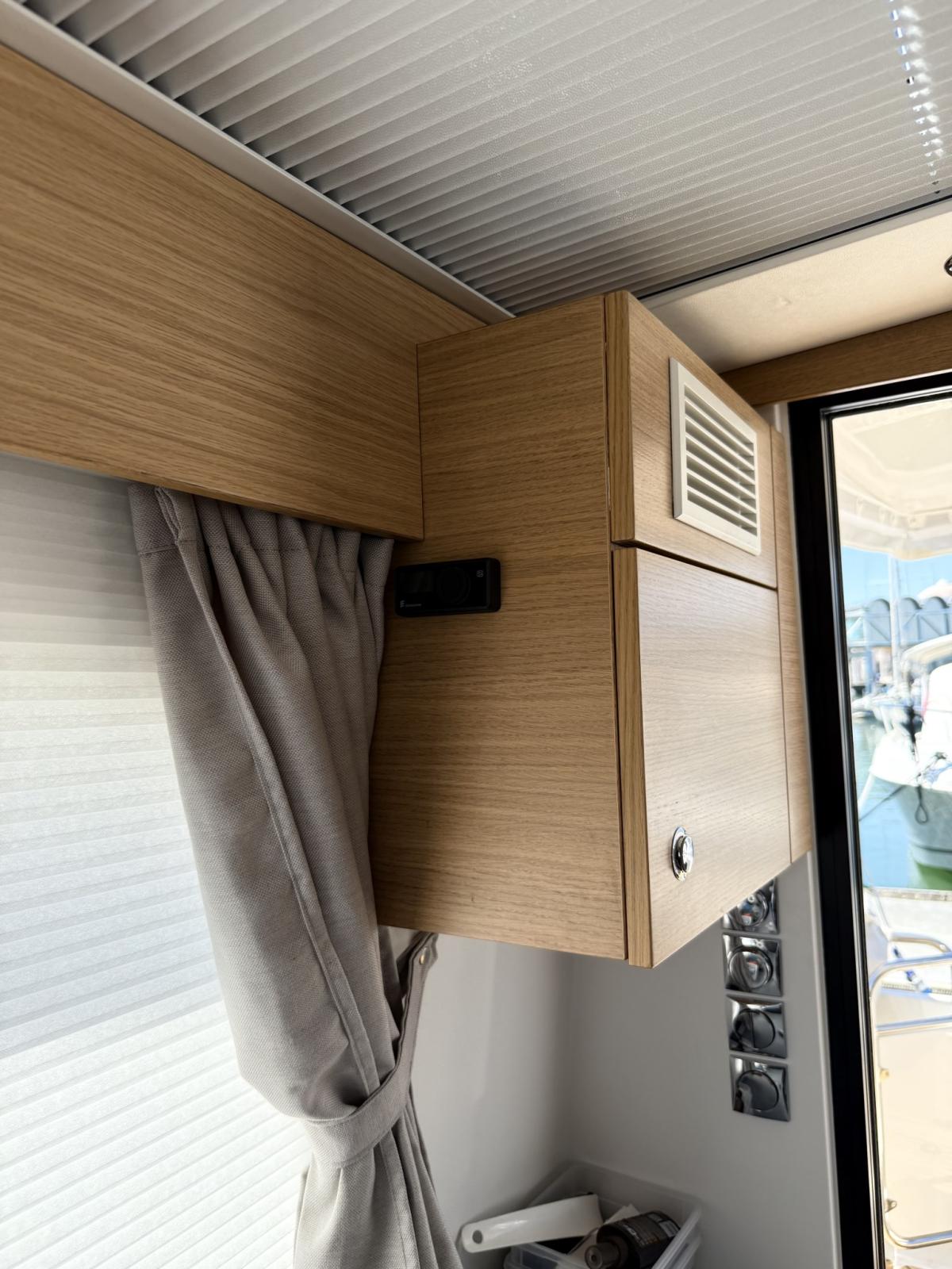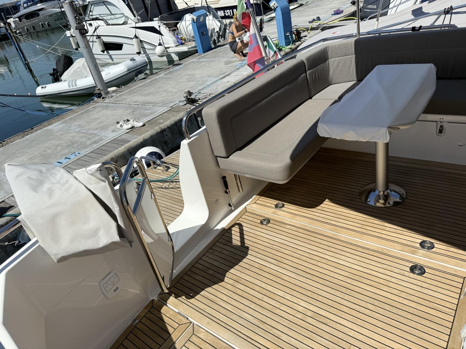 Alarme moteur, Alarme de pompe de cale, Eau sous pression, Douche de cockpit, Phare de poursuite, Flaps électriques (Humphree), Indicateurs de flaps, Éclairage de courtoisie, Plateforme arrière, Pompe de cale automatique, Pont en teck, Porte latérale, Cockpit en teck, Prise de quai, Guindeau électrique, Echelle de bain, table de cockpit, Corne.