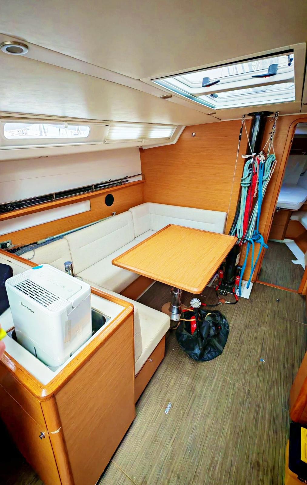 Ancre (Delta), Eau sous pression, 3 Batteries, Douche de cockpit, Double barre à roue, Pompe de cale manuelle, Cockpit en teck, Prise de quai, Répétiteur électronique, Guindeau électrique, Gréement Rod, Echelle de bain, Tuff Luff, 5 Winch, Windex.