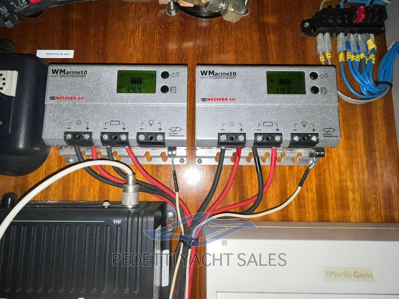 Raymarine électronique GPS/plotter, ECO, VHF, pilote automatique, propulseur d’étrave, pont en teck massif, nouveau système stéréo FUSION MS-RA770, double chargeur, panneaux solaires avec écran de contrôle, phare en acier inoxydable surdimensionné, chaîne et ancre.