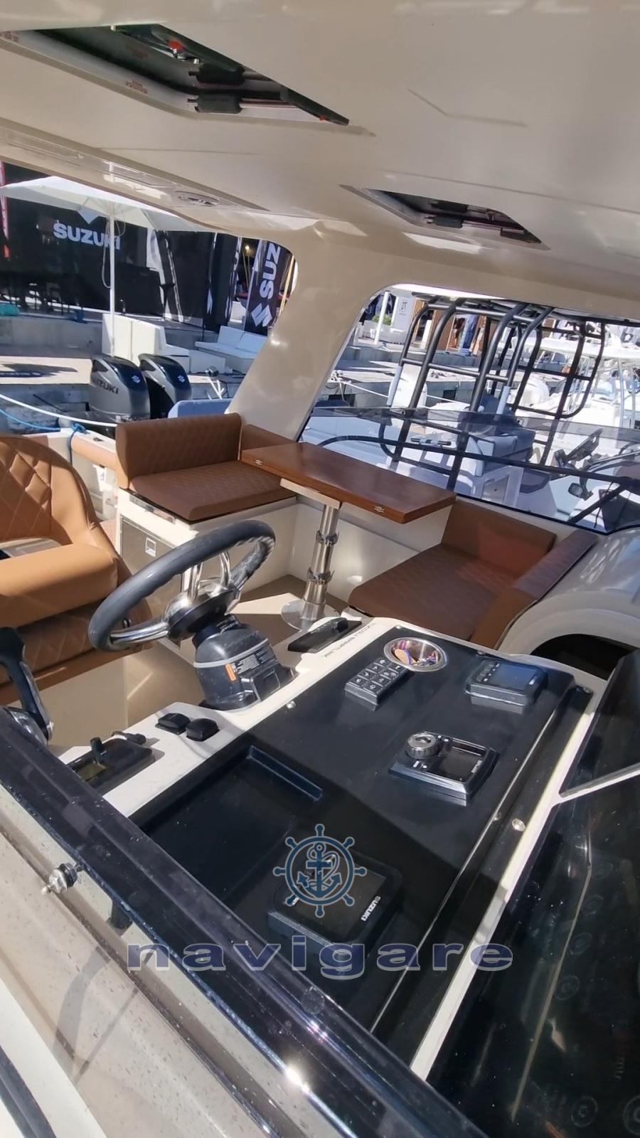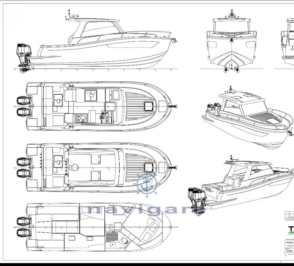 Un hardtop protège la cuisine/salle à manger ainsi que la console, qui regarde vers la proue où un grand pont ouvrier définit la proue comme espace de détente pour la famille du pêcheur. La coque classique du Tuccoli porte ce bateau à 43 nœuds de poussée contre 600 ch, en version simple ou bimoteur, exclusivement à l’extérieur. Pour la vitesse de croisière, cependant, cette coque est d’environ 25 nœuds.