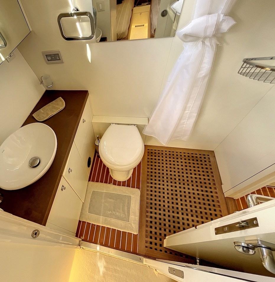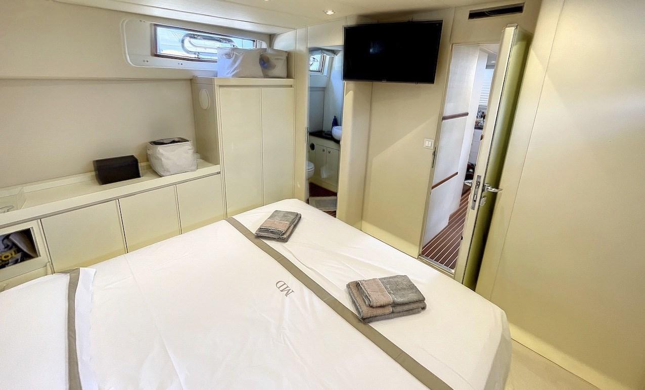Cabine principale avec lit double et salle de bain - cabine d’amis avec deux lits et salle de bain - cabine arrière avec lit double et salle de bain - cabine de marin avec commodités.
