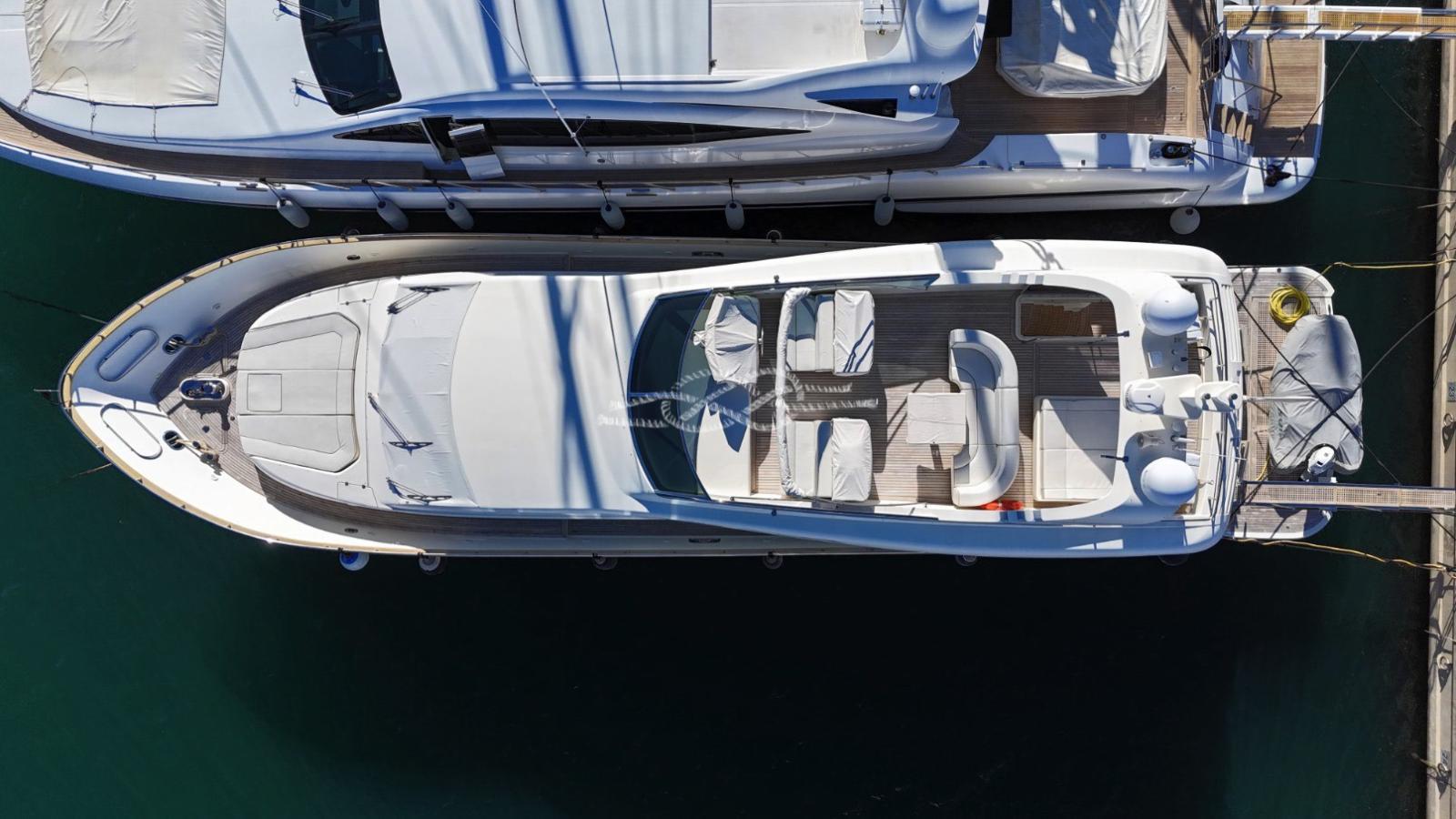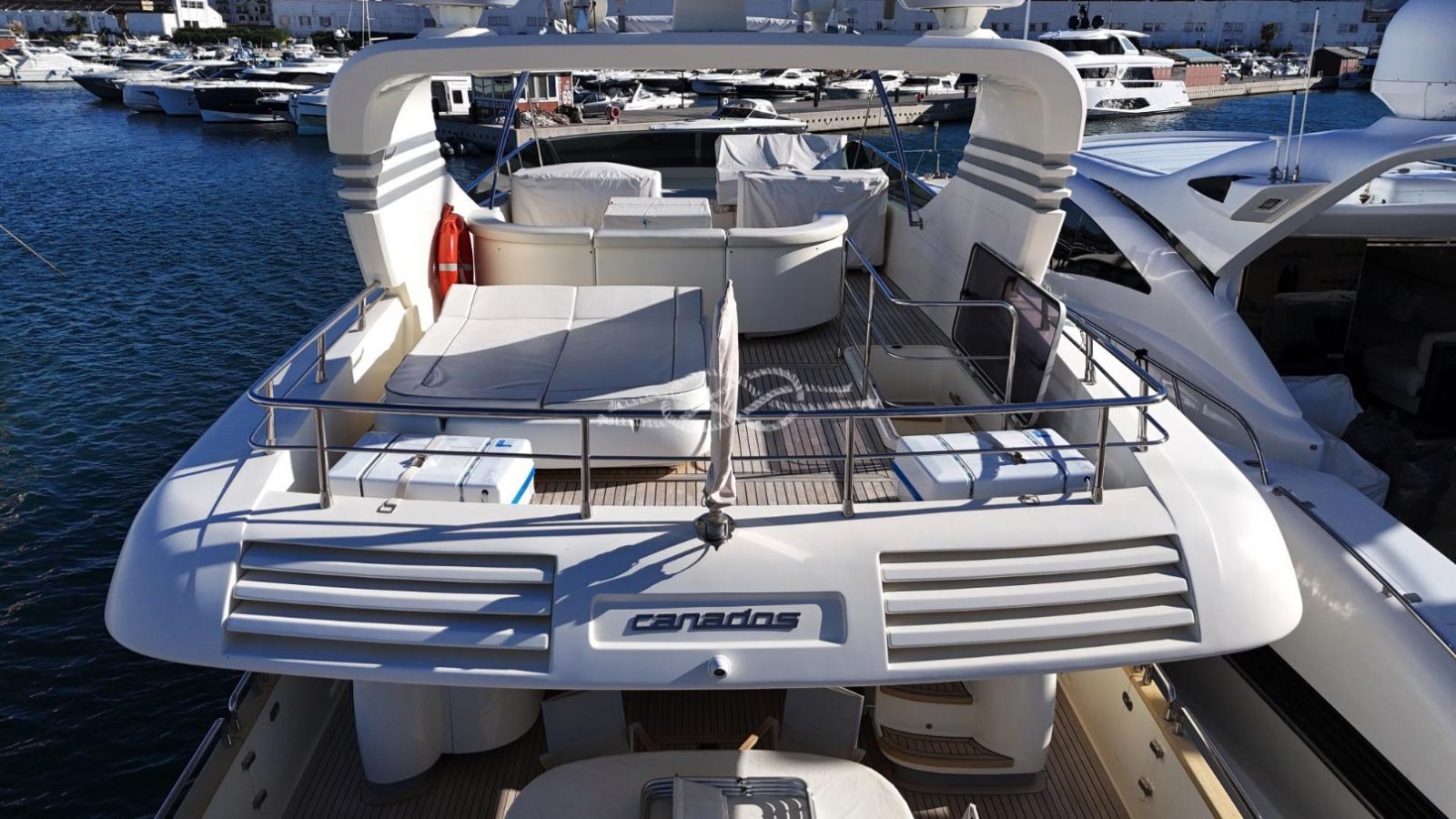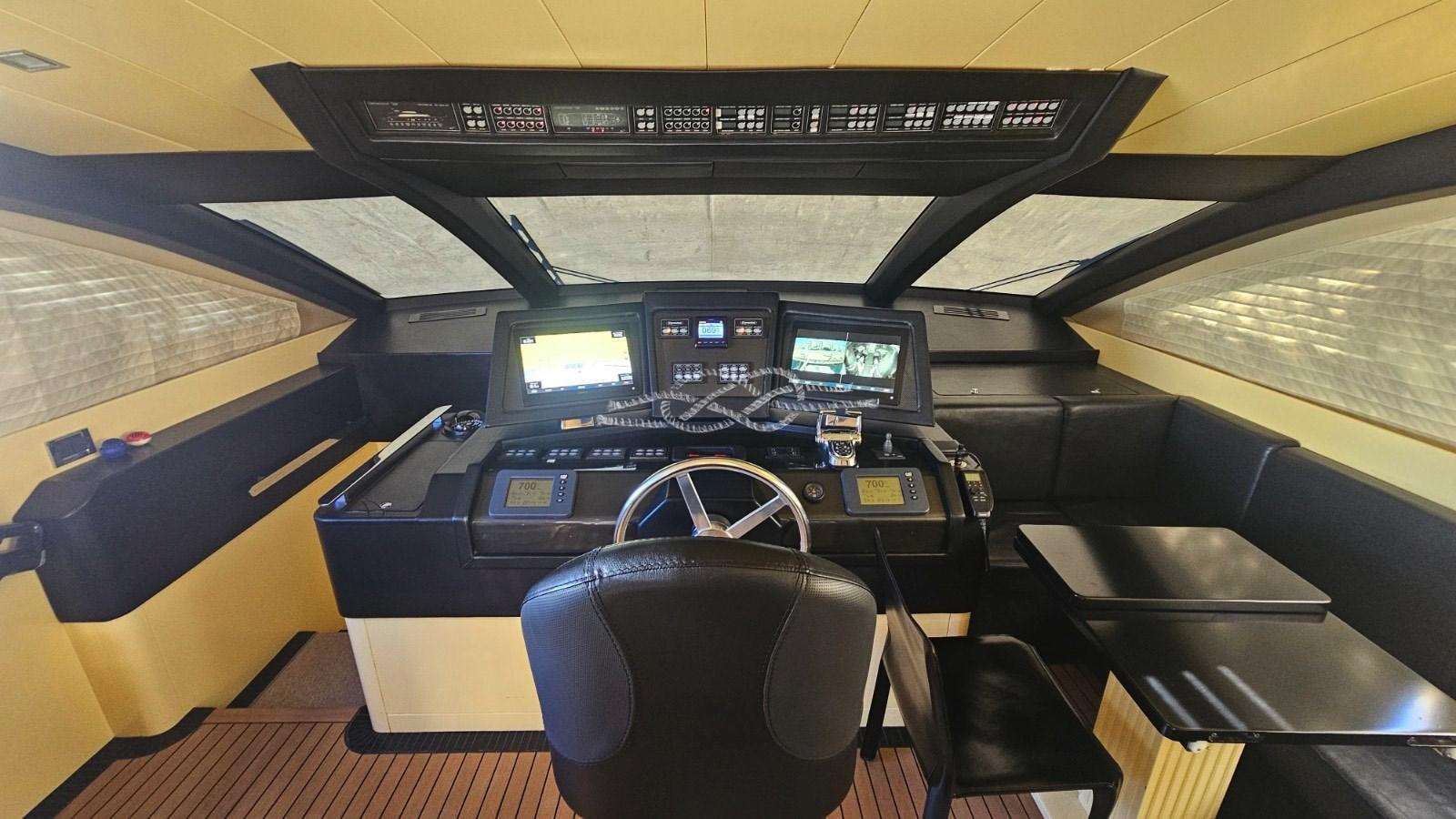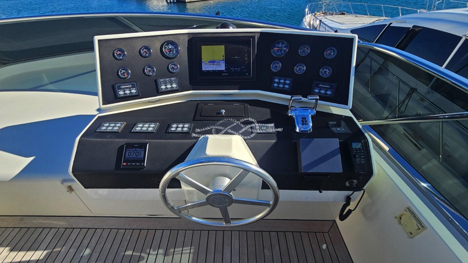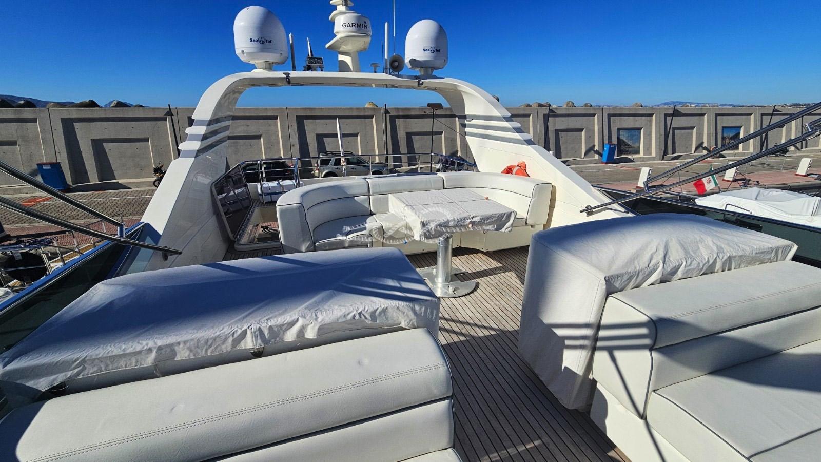 Alarme moteur, Alarme de pompe de cale, Eau sous pression, 16 Batteries, Système de vidange, Passavant en teck, Douche de cockpit, Double barre à roue, Phare de poursuite, Flaps hydrauliques, Grue de flybridge, Extincteur(s) fixe(s), Indicateurs de flaps, Lavage de chaine, Spots sous-marins, Passerelle (elettroidraulica a scomparsa), Plateforme arrière, Pompe de cale automatique, Porte latérale, Porte latérale, Cockpit en teck, Prise de quai, Connexion eau sous pression à quai, Rollbar, Guindeau électrique, Echelle de bain, Selles pour Annexe, table de cockpit, Annexe (Capelli con fuoribordo), Filières avec sortie latèrale, Corne, Winch électrique arrière.