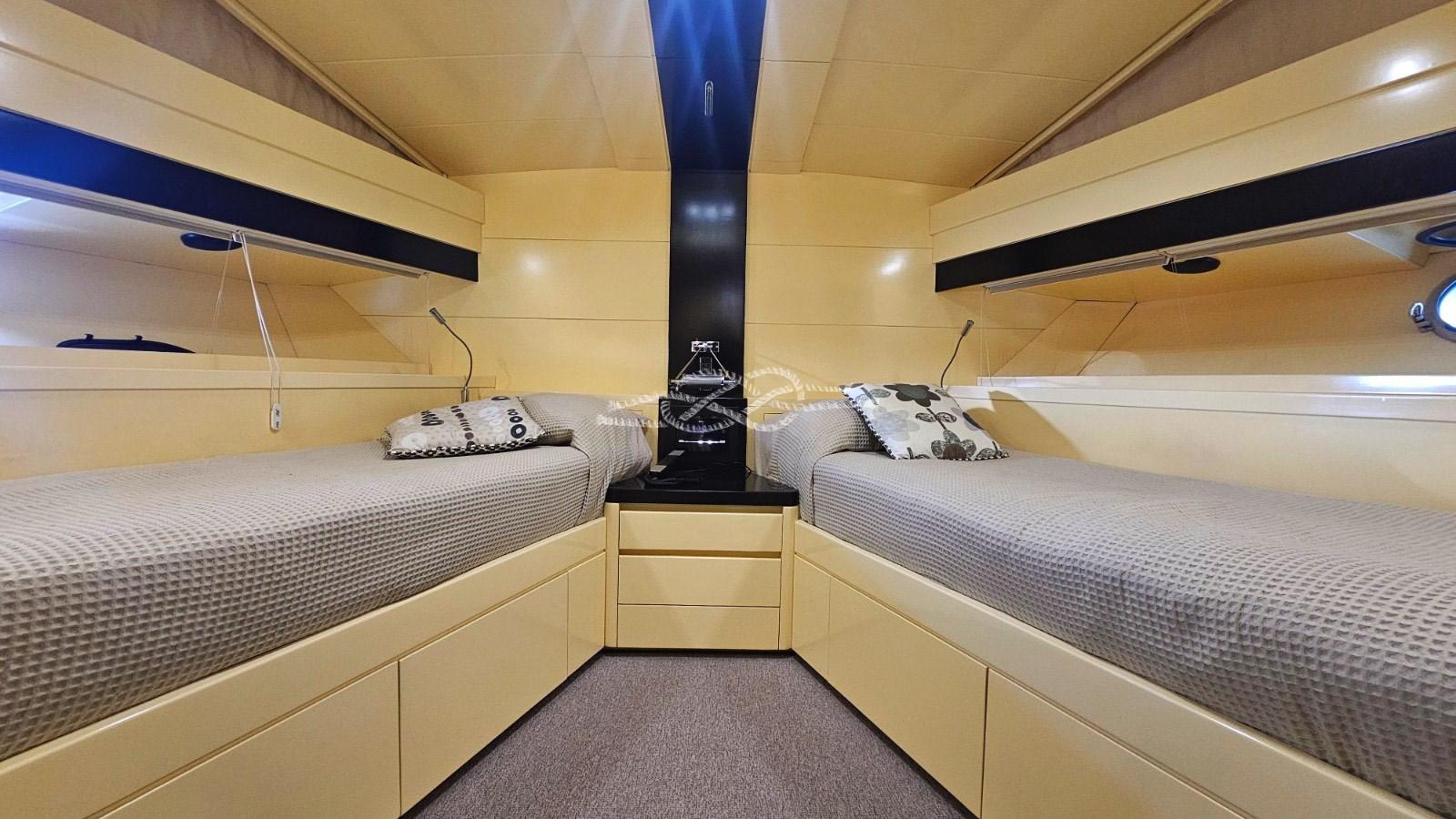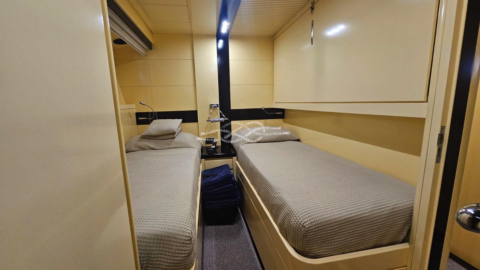 Cabine principale avec lit double, dressing, salle de bain avec douche et bidet séparés - cabine VIP avec deux lits plats, dressing, salle de bain avec douche et bidet séparés - cabine d’invités avec deux lits plats et troisième lit escamotable, salle de bain avec douche et bidet séparés (la salle de bain a un accès double afin de servir également de salle de bain pour les invités) - cabine d’invités avec deux lits plats et un troisième lit escamotable, Salle de bain avec douche séparée et bidet.