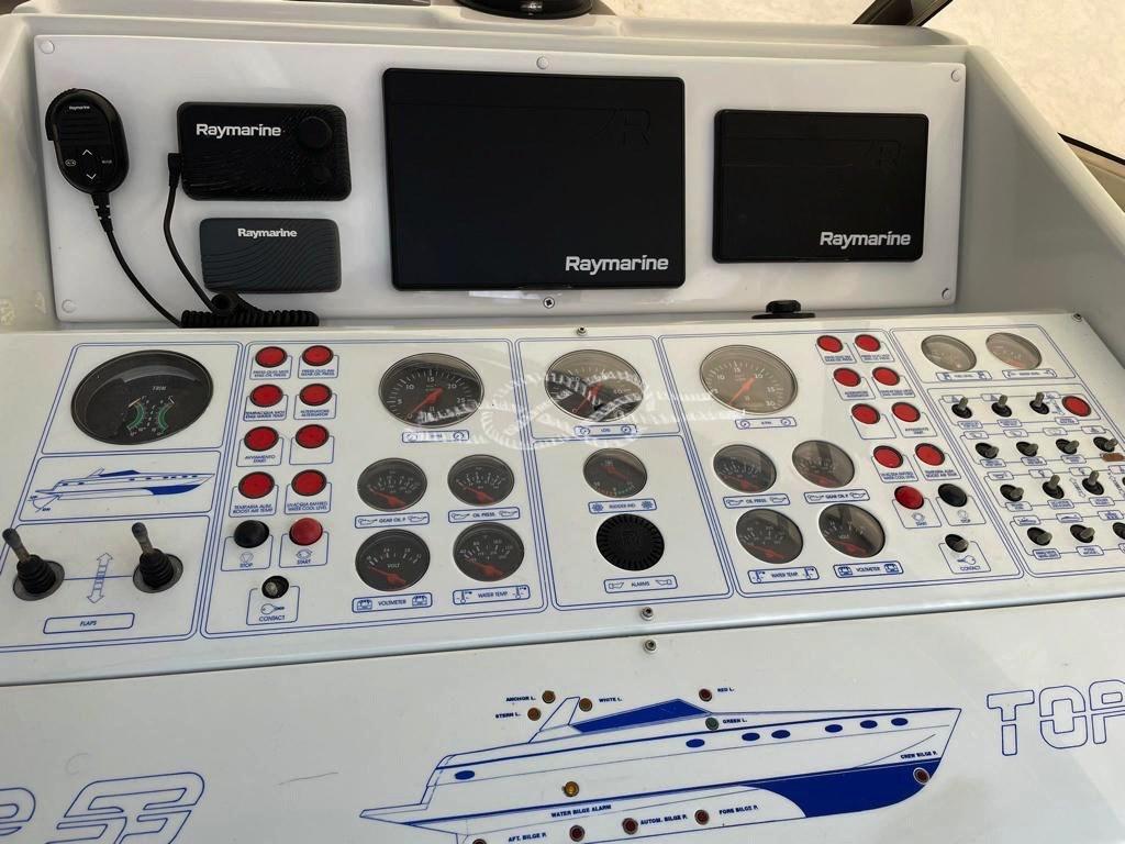 Alarme moteur, Eau sous pression, Système de vidange, Douche de cockpit, Phare de poursuite, Flaps hydrauliques, Hard top, Extincteur(s) fixe(s), Indicateurs de flaps, Éclairage de courtoisie, Spots sous-marins, Passerelle, Plateforme arrière, Cockpit en teck, Prise de quai, Guindeau électrique, Echelle de bain, table de cockpit, Corne.