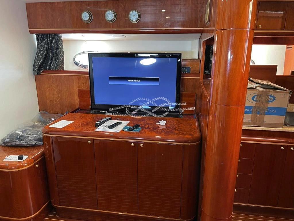 Passerelle électro-hydraulique - caméra de la salle des machines (2022) - ANTENNE SAT TV Seatel - Antenne TV Glomex - TV LCD rétractable dans le salon - Cabine principale TV LCD - micro-ondes - plaque électrique à trois brûleurs - réfrigérateur - armoire de bar dans le cockpit avec évier, plaque électrique à deux brûleurs - propulseur d’étrave électrique - groupe électrogène Kohler 8 kW - climatisation.