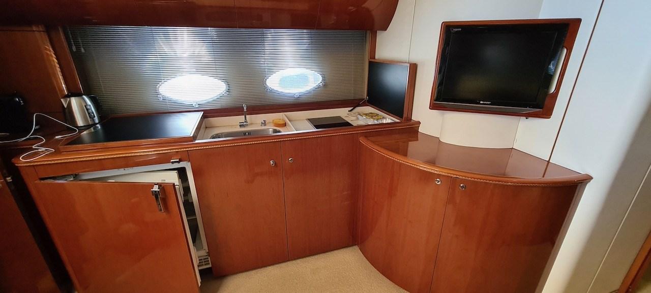 Climatisation - dessalinisateur - groupe électrogène 9 kW - passerelle électro-hydraulique - garage à annexe - propulseur d’étrave - annexe avec hors-bord - réfrigérateur - meuble bar dans le cockpit avec réfrigérateur, plaque de cuisson électrique et évier.