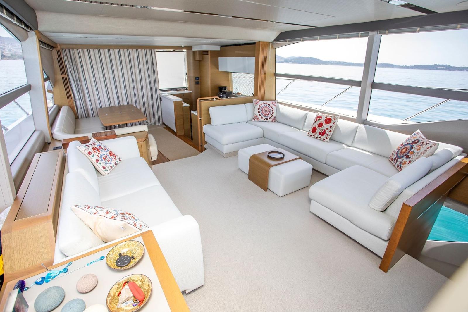 Propulseur de poupe - propulseur d’étrave - climatisation - cuisine - four - four à micro-ondes - réfrigérateur - lave-linge - sèche-linge - dessalinisateur - grill - table de cockpit - table de flybridge - deux groupes électrogènes Onan 19 et 11 kW - double poste de pilotage - troisième poste de commande de poupe - ailerons stabilisateurs (Sleipner VF800) - passerelle hydraulique - pont arrière hydraulique - moustiquaires - TV LCD - antenne de télévision par satellite.