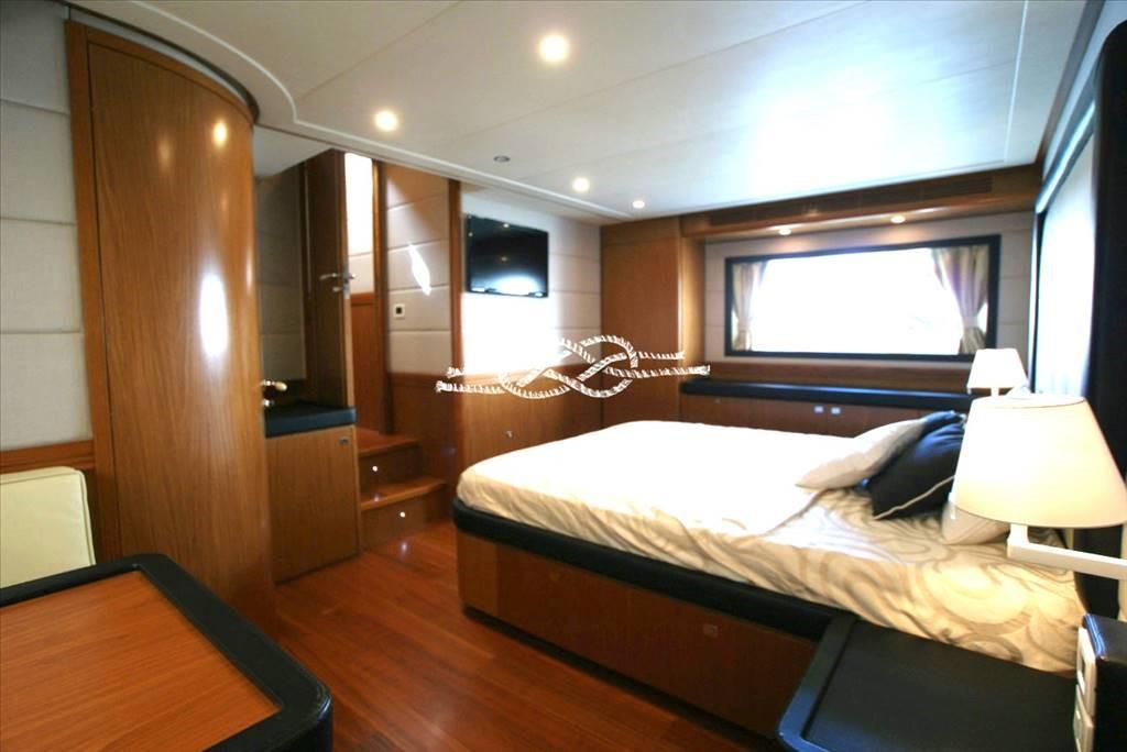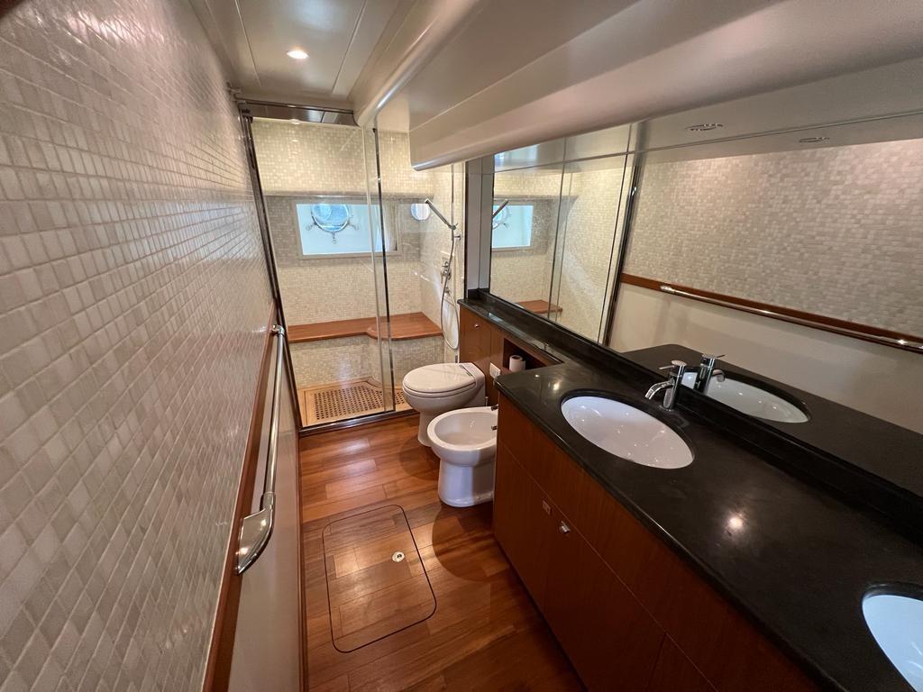 Cabine principale au milieu du navire avec lit double et petit dressing, salle de bain pleine largeur avec douche séparée - Cabine VIP avec lit double et salle de bain - cabine d’invités avec deux lits au sol - cabine d’invités simples - salle de bain d’invités - deux cabines d’équipage simples - salle de bain d’équipage.