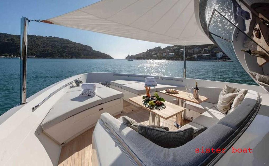 Alarme moteur, Alarme de pompe de cale, Eau sous pression, Couleur spéciale, Douche de cockpit, Flaps hydrauliques, Hard top, Extincteur(s) fixe(s), Indicateurs de flaps, Éclairage de courtoisie, Spots sous-marins, Passerelle, Plateforme arrière, Porte latérale, Cockpit en teck, Prise de quai, Connexion eau sous pression à quai, Onduleur, Rollbar, Guindeau électrique, Echelle de bain, Selles pour Annexe, Stabilisateurs, Corne, Winch électrique arrière.