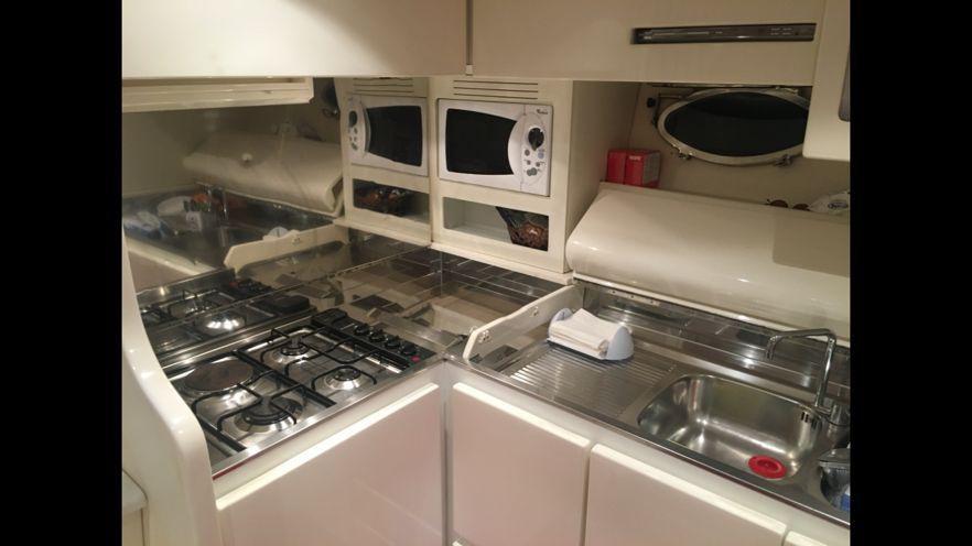 Passerelle électrohydraulique - Générateur Kohler 6,5 kW - fournecôte à gaz à 4 brûleurs - réfrigérateur - congélateur - micro-ondes - antenne TV - TV LCD - meuble bar cockpit avec évier et plaque à gaz à 2 brûleurs - propulseur électrique d’avant à alimentation latérale - Machine à eau Schenker.