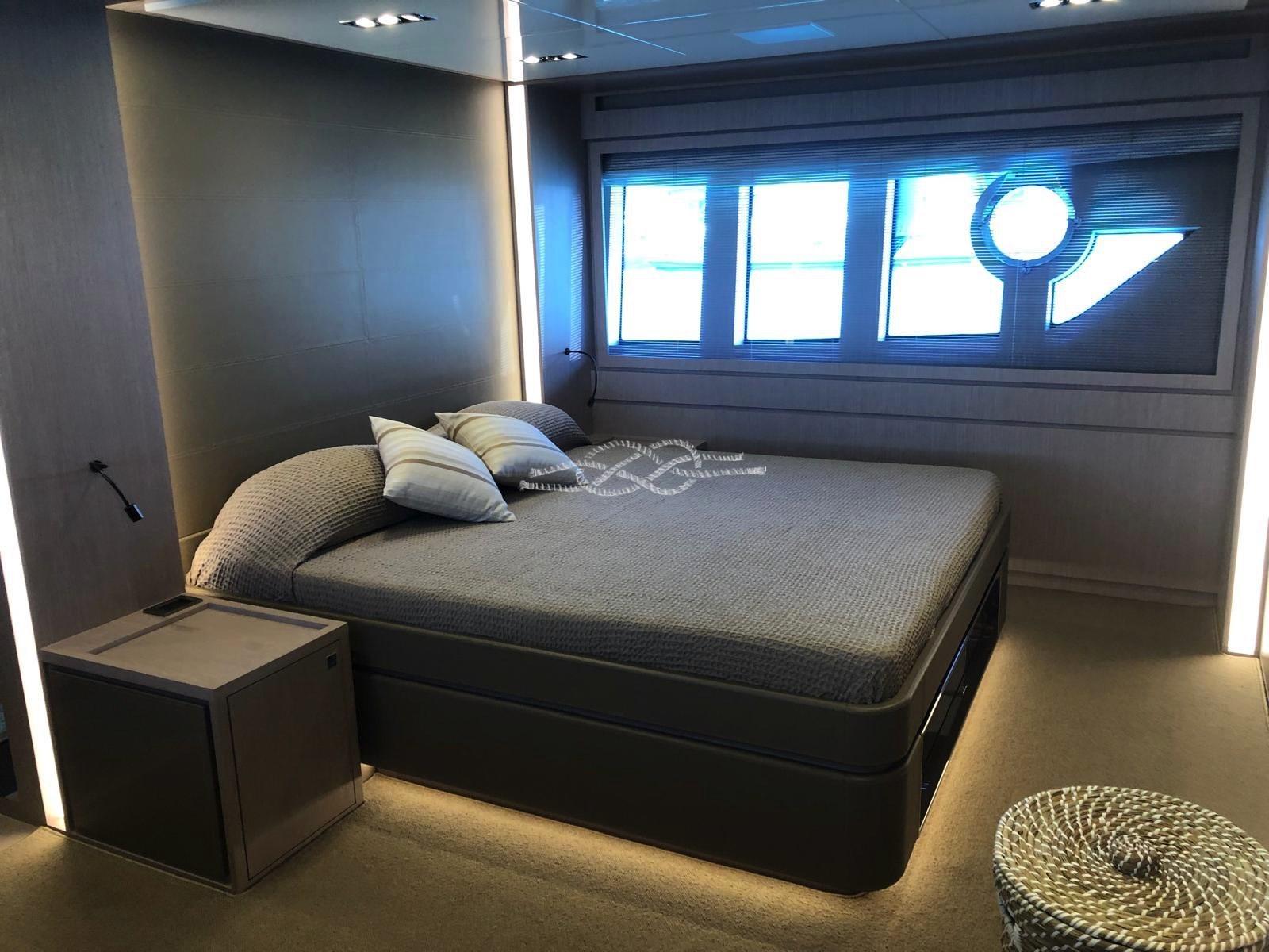 Cabine principale avec lit double, dressing, salle de bain - cabine VIP avec lit double et salle de bain - cabine d’invités avec lit double et salle de bain - cabine d’invités avec deux lits plats - salle de bain invités.