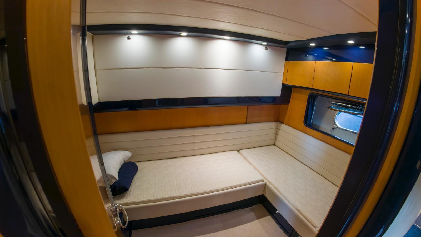 Cabine principale avec lit double et salle de bain - cabine d’amis avec deux lits en forme de L et salle de bain - cabine d’amis avec deux lits plats et salle de bain (à l’arrière).